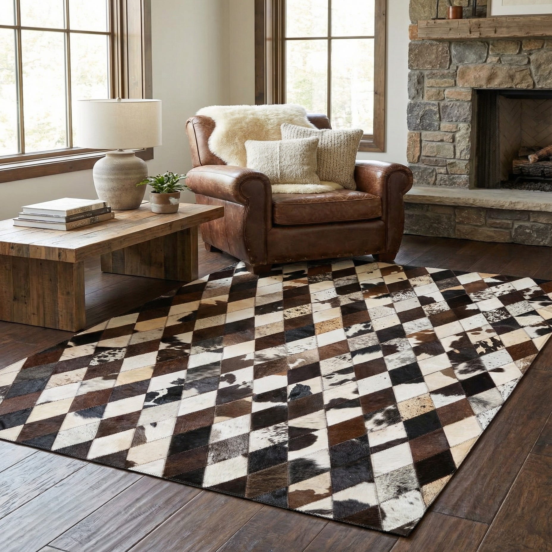 A 4x6 rectangular cowhide rug featuring a modern diamond patchwork pattern in various shades of brown, black, and white.