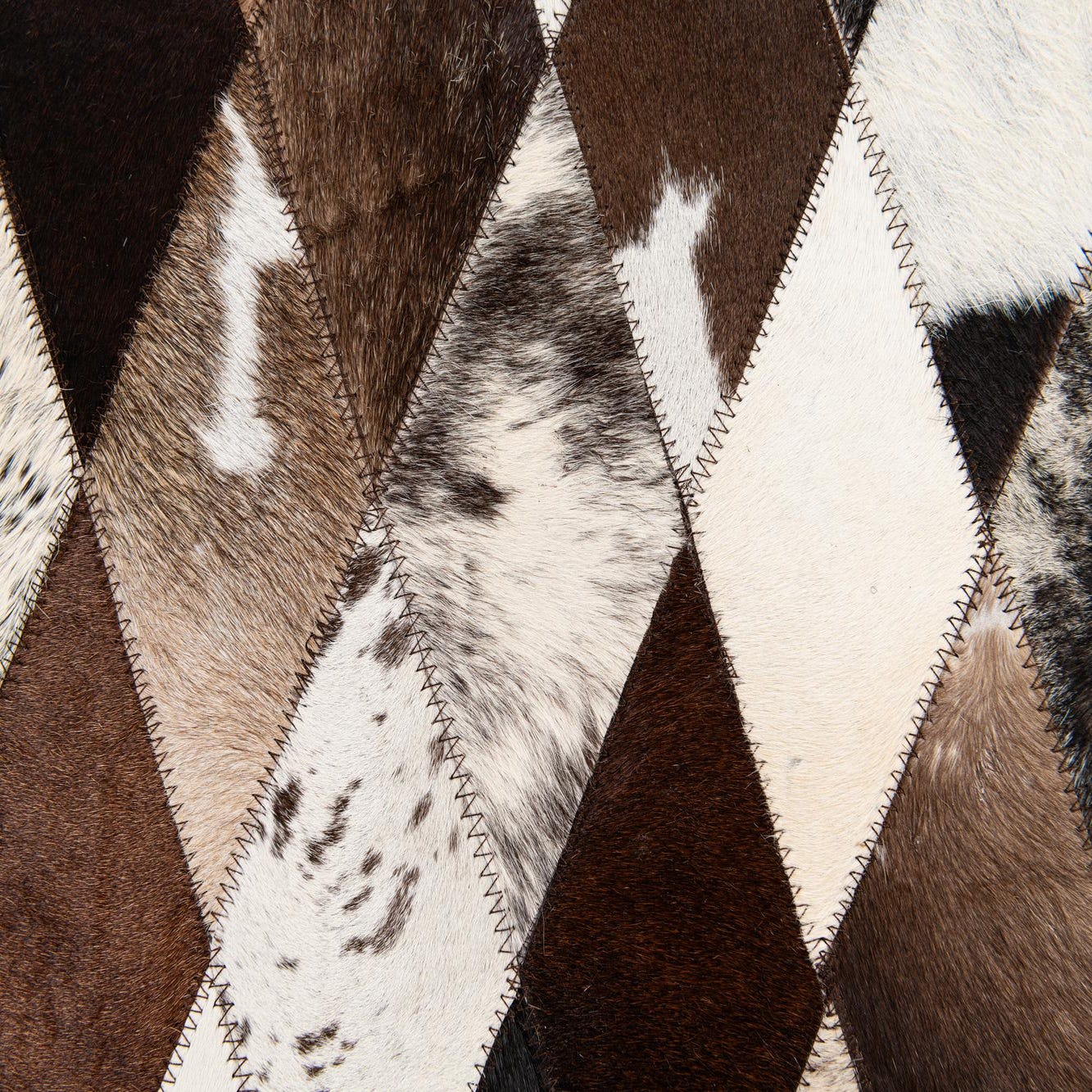 A geometric patchwork of stitched diamond panels creates a bold, graphic surface in warm, natural tones. Panels of cowhide in beige, ivory, tan, light brown, brown and black are arranged on a multi background, forming a repeating harlequin pattern with visible hand-stitching that adds subtle texture and definition. The hair-on-hide surface is smooth with a soft nap and natural color variations and markings that give the rug a tactile presence; the leather backing provides structure and durability consistent with handmade construction from cowhide and leather.