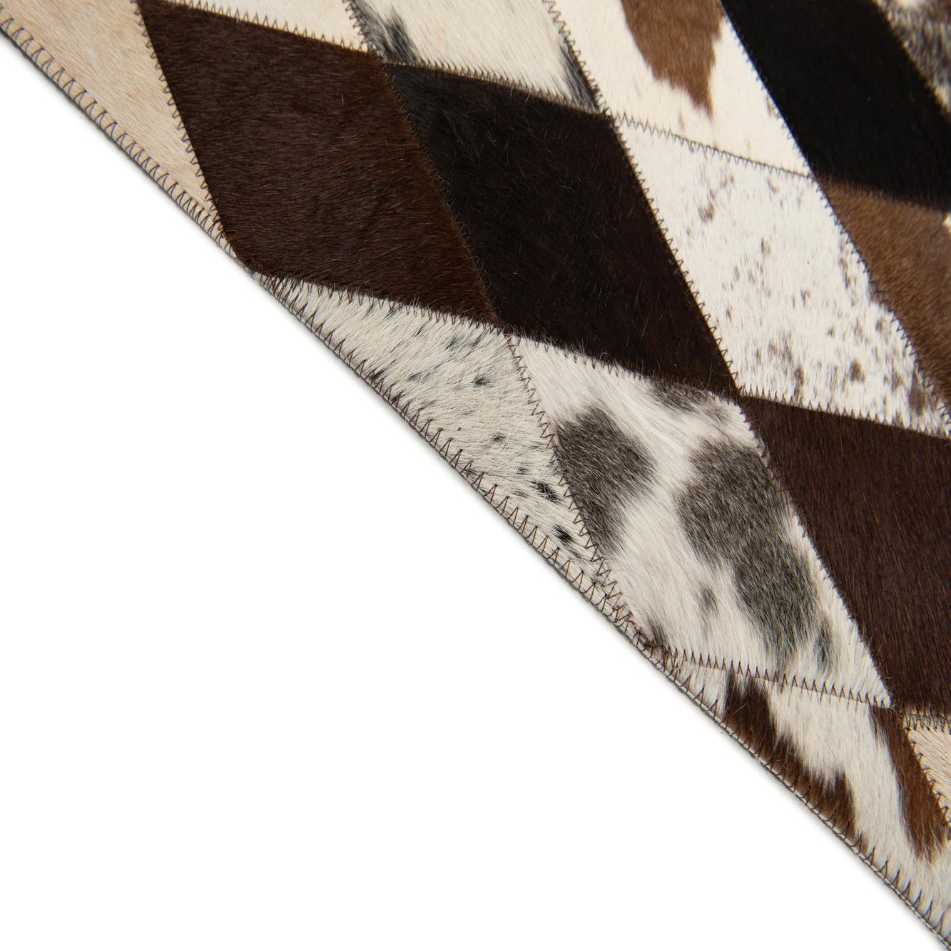 A 4x6 rectangular multi-colored cowhide rug featuring a modern diamond patchwork pattern in various shades of brown, black, and white.