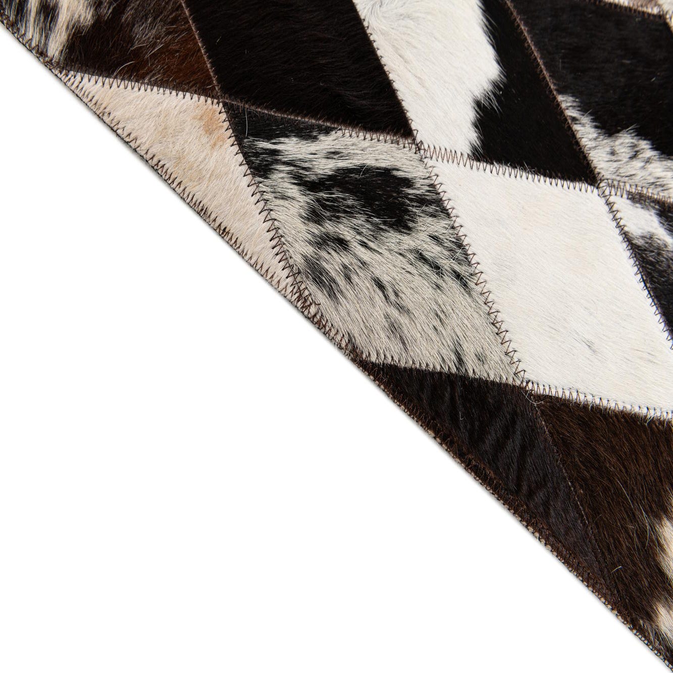 A 4x6 rectangular Cowhide Stocks rug featuring a modern diamond patchwork pattern in multi-colored natural cowhide and leather.