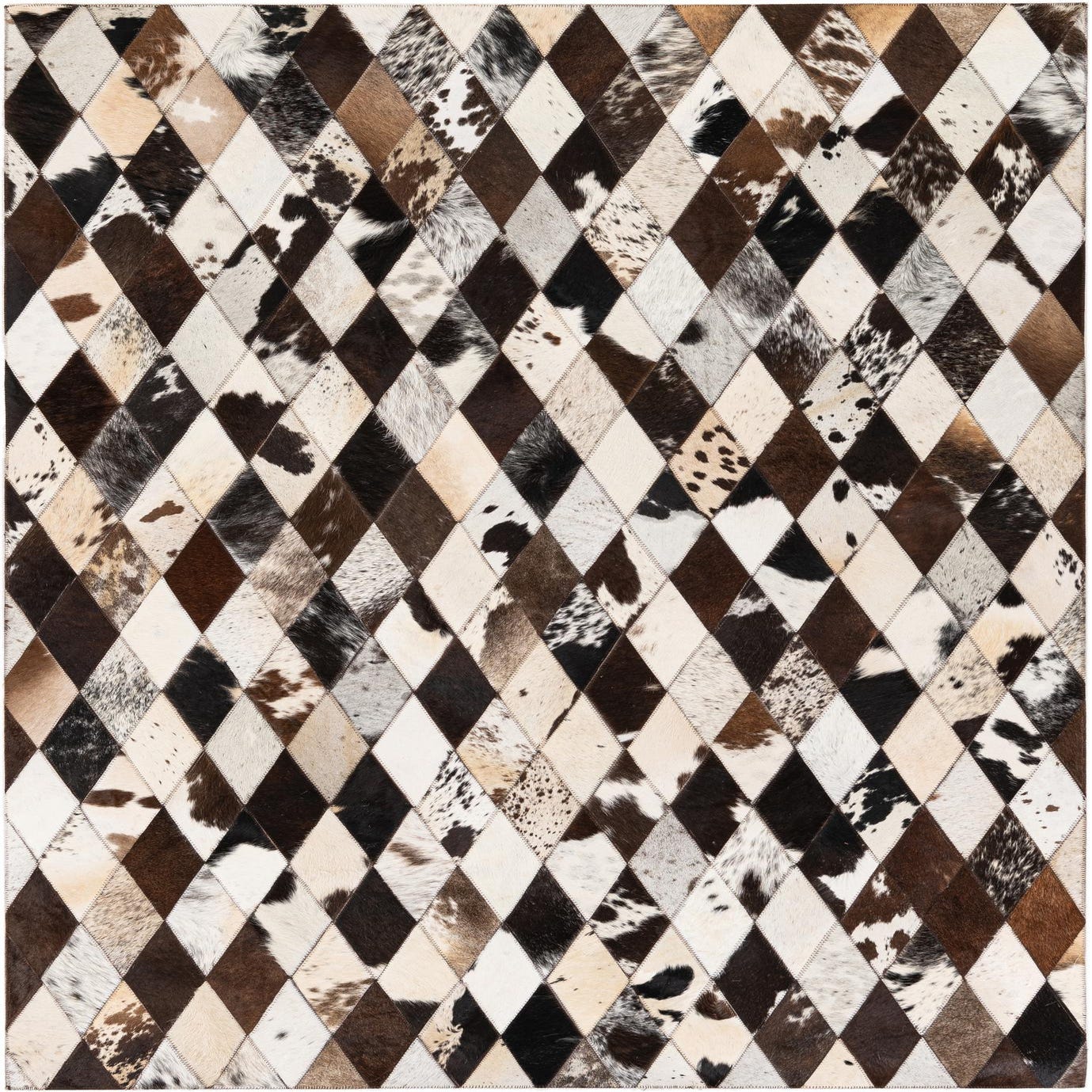 A 4x6 rectangular Cowhide Stocks rug featuring a modern multi-colored diamond pattern made from various cowhide patches.