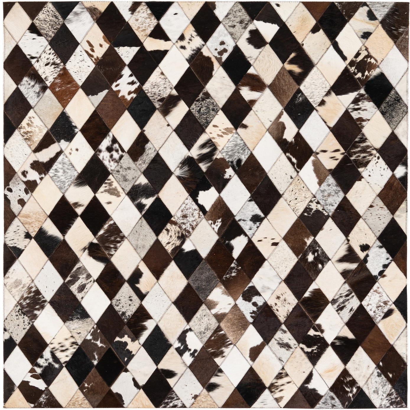 A 4x6 rectangular Cowhide Stocks rug featuring a modern diamond patchwork pattern in multi-colored natural cowhide and leather.