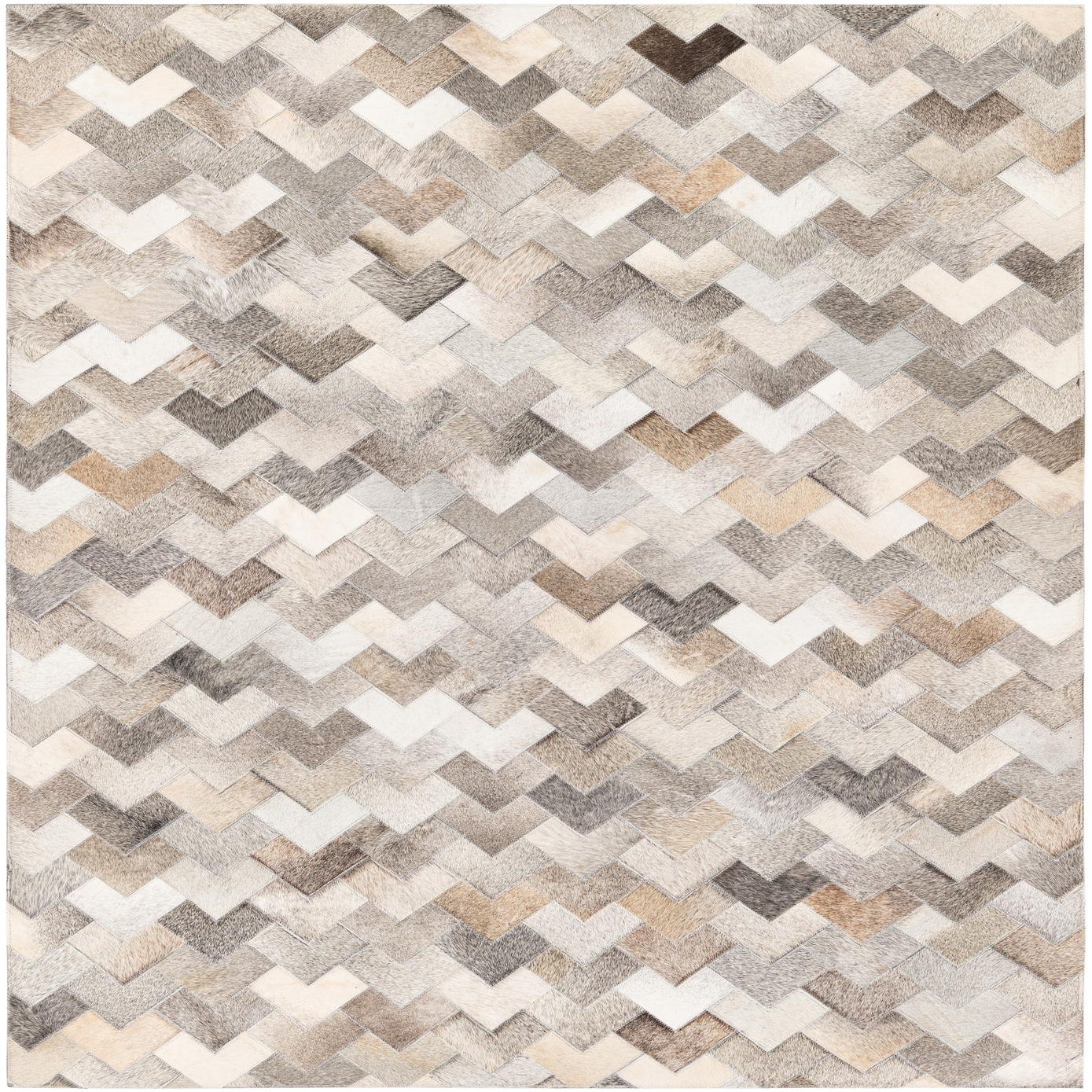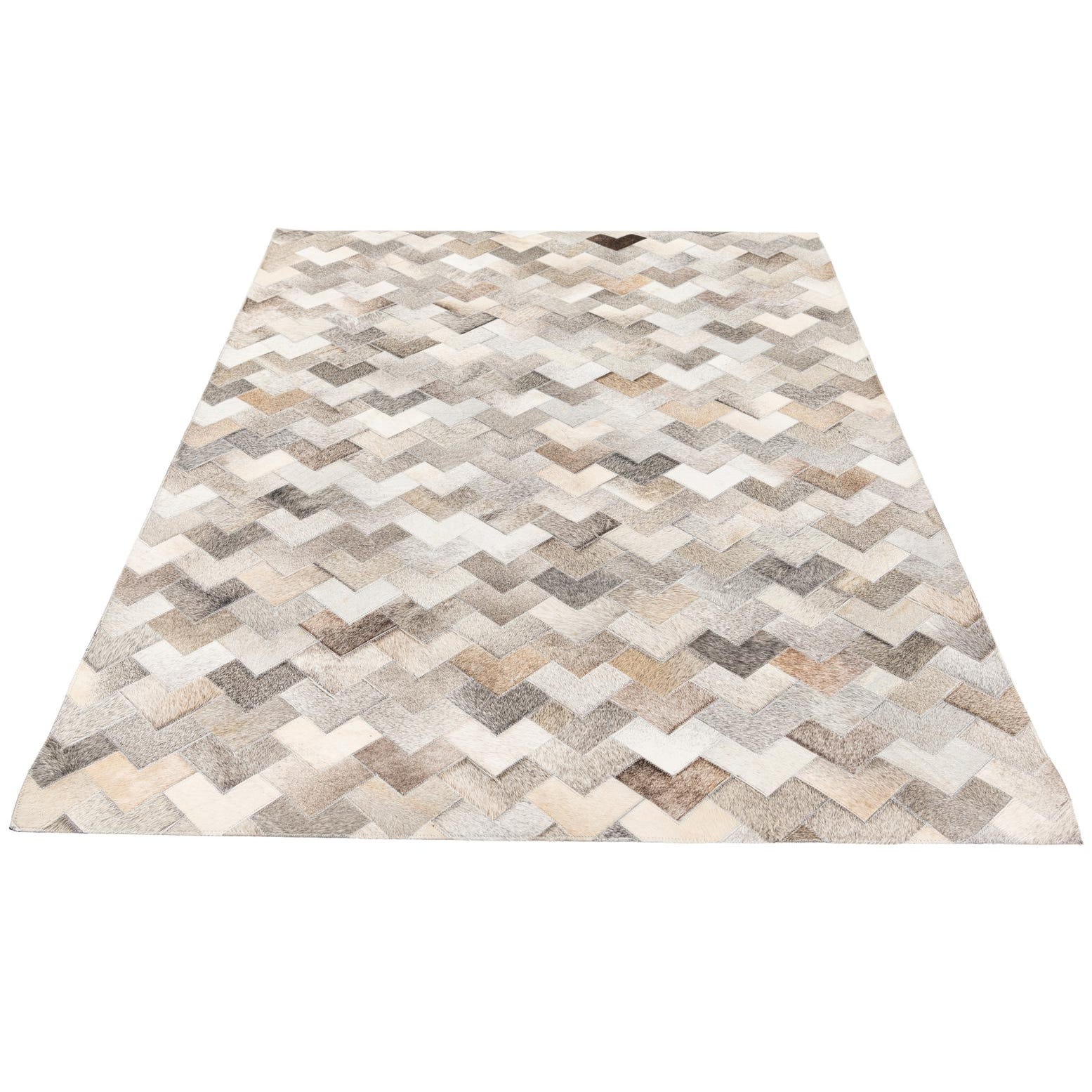 A rectangular 4x6 modern cowhide rug featuring a chevron pattern in various shades of brown, beige, and gray.