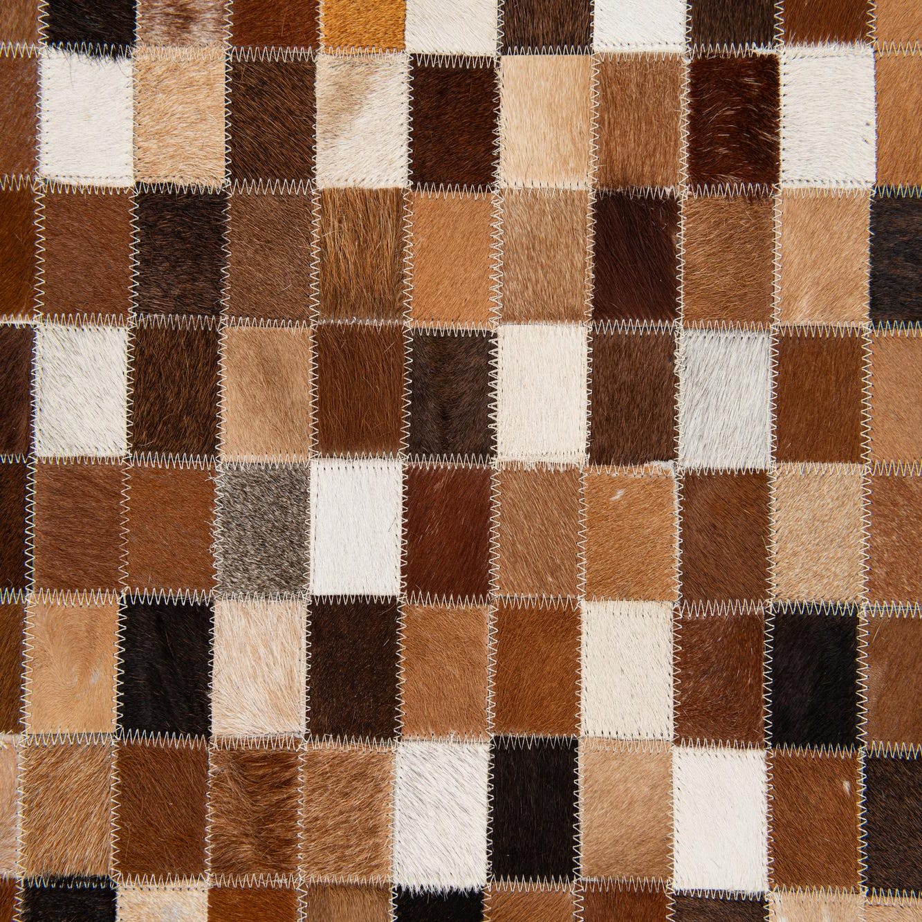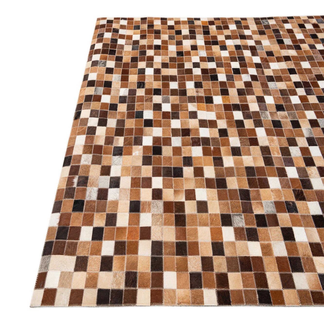 A grid of small, hand-stitched squares creates a refined patchwork pattern in warm neutrals. Handmade from cowhide and leather, the surface alternates beige, tan, brown, ivory and black tiles across a multi background. Each hair-on-hide square has a soft, velvety nap and a subtle sheen, while the visible stitching between panels adds a tailored, tactile edge that gives the rug depth and structure.