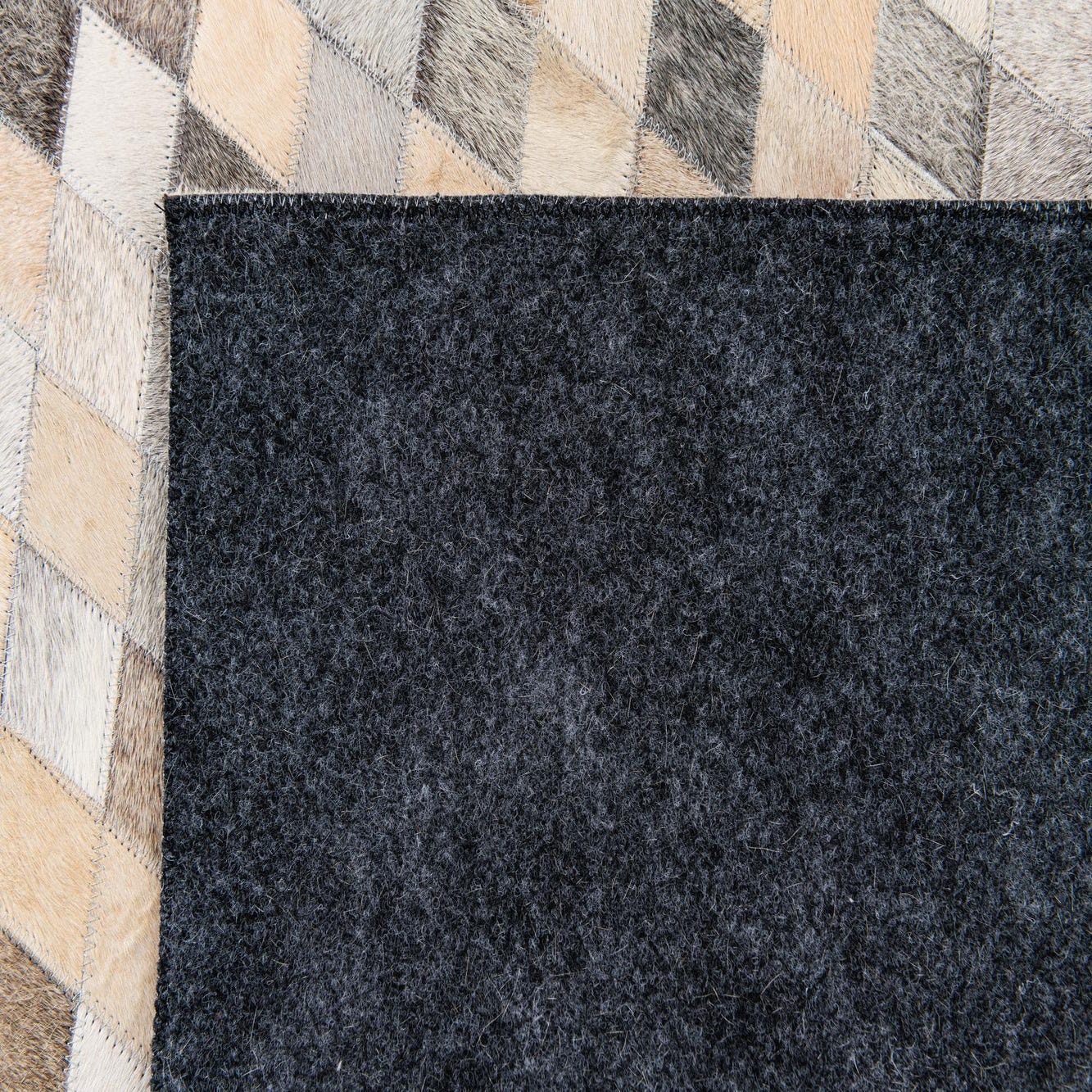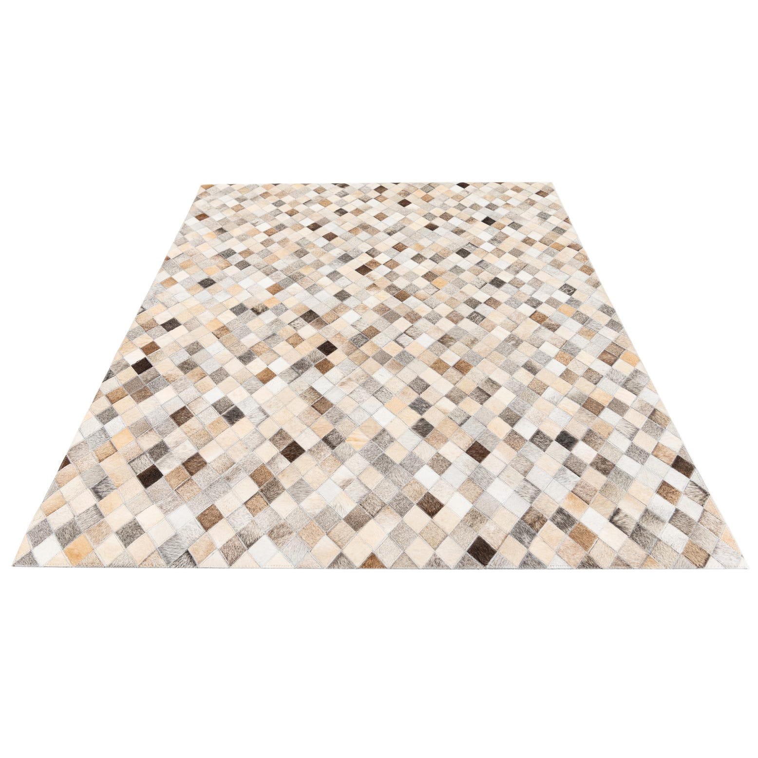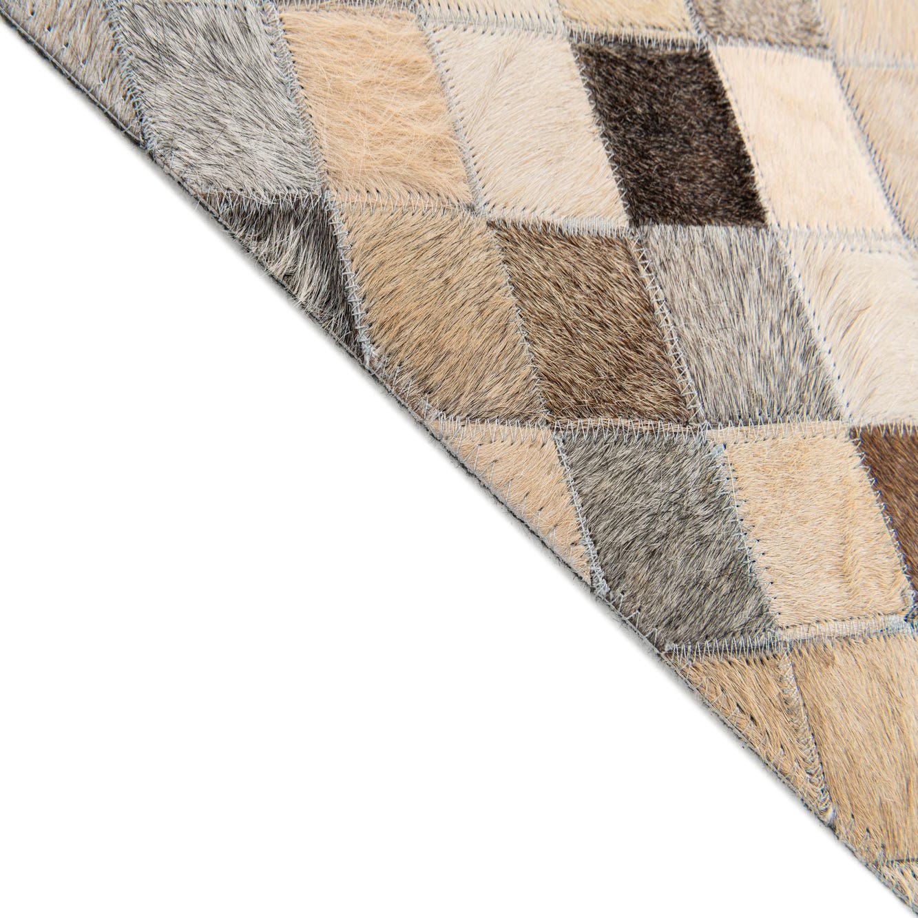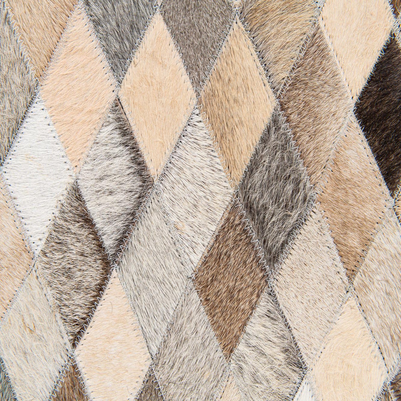 A tightly stitched harlequin of small diamond patches gives this hand?made cowhide rug a refined geometric rhythm. Each tile carries natural variations in hair direction and tone — ivory, beige, tan, light brown, warm brown and occasional black accents — creating a soft, multi-tonal field that reads as layered and organic. The surface feels smooth with a low, natural nap; running your hand across it reveals subtle shifts in texture where the hair lies differently on each patch and the visible stitching adds a crafted, tactile detail.