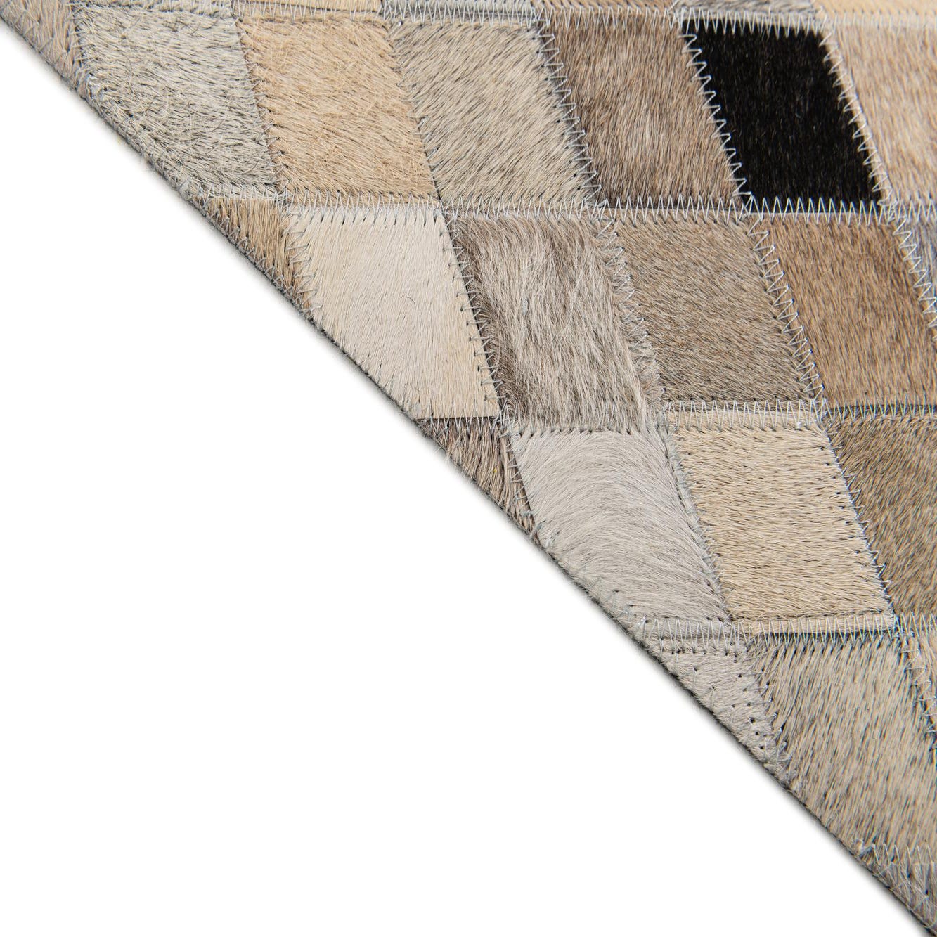 A 4x6 rectangular Cowhide Stocks rug featuring a modern patchwork of multi-colored diamond-shaped cowhide and leather pieces in various shades of brown, beige, cream, and black.