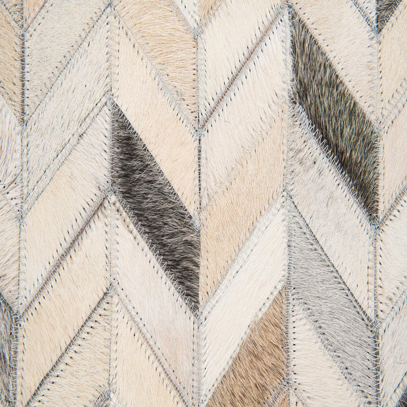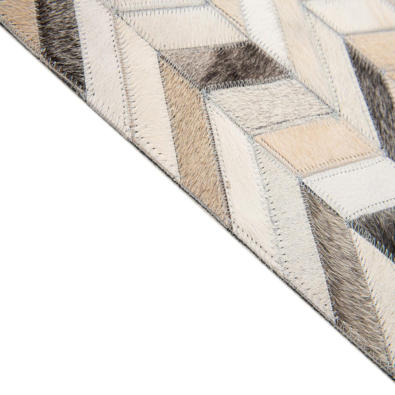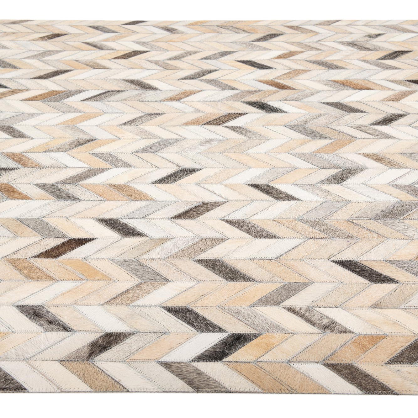 A rectangular 4x6 multi-colored cowhide rug featuring a modern chevron pattern in shades of brown, beige, and cream.