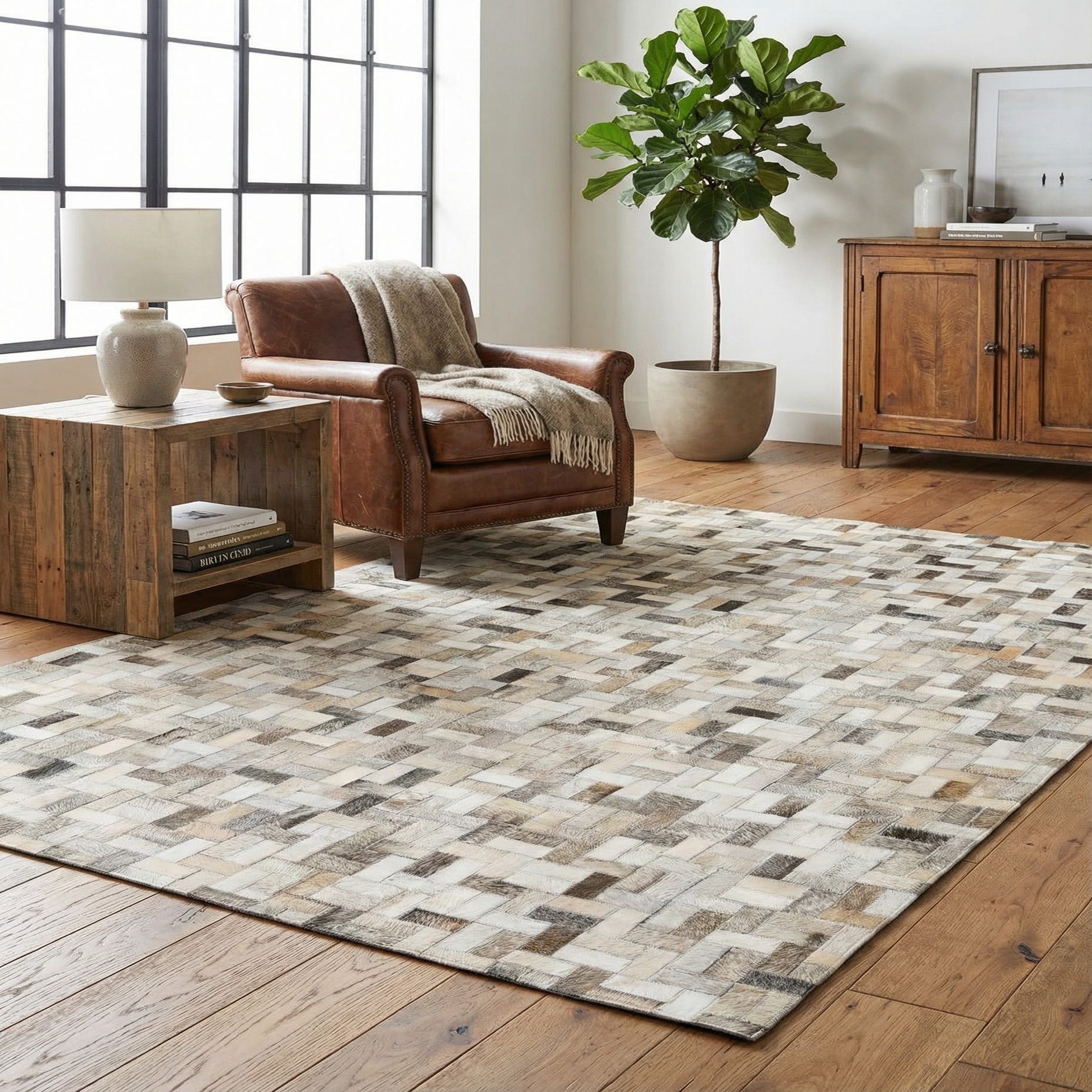 A handcrafted patchwork of small rectangular cowhide panels creates a subtle geometric mosaic across the surface. The multi-tonal background blends beige, ivory, tan, gray and brown patches for layered depth and visual texture without strong contrast. Directional hair and neat stitching define each tile, producing a modern, woven effect that works equally well in contemporary or rustic settings.
