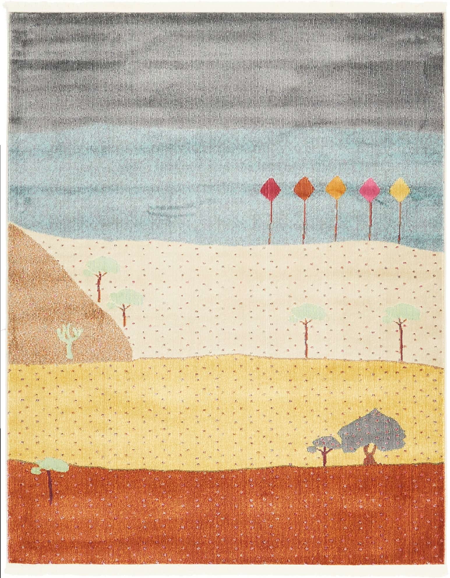 Primary color is Multi. Colors in this rug include: Multi, Blue, Cream, Gold, Gray, Brown, Light Blue, Red, Yellow.