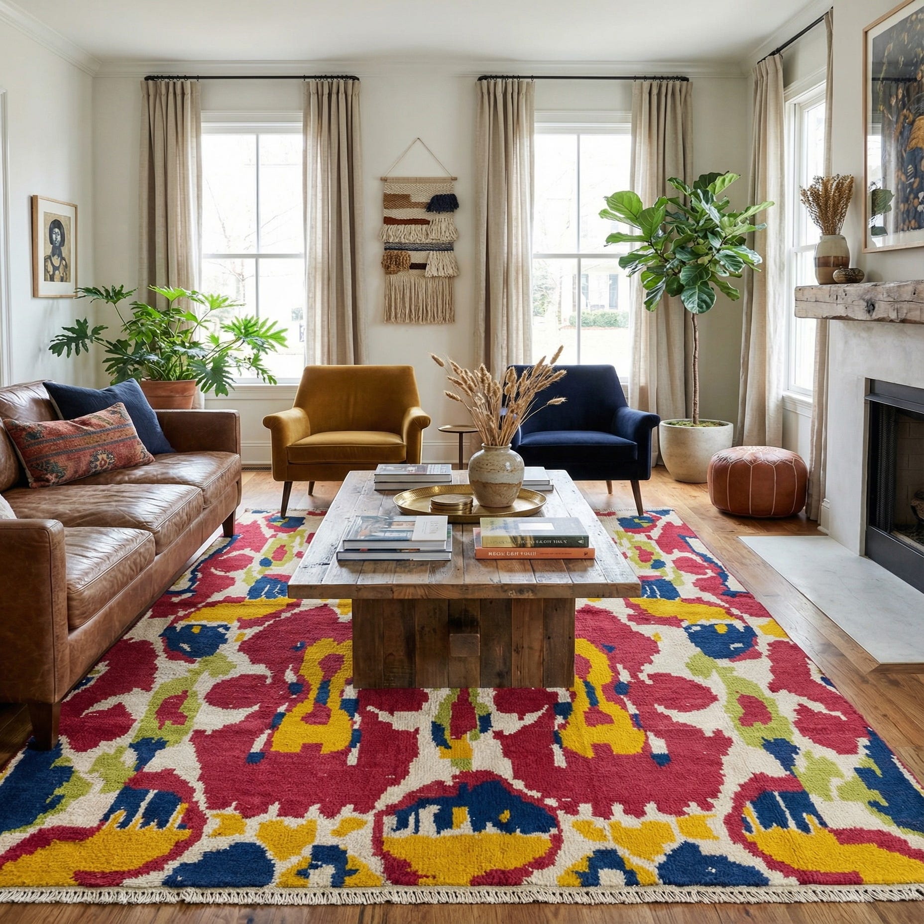 With its woolen texture, this rug provides a pleasant underfoot experience and serves as a durable choice for living spaces. The fringe detail on the edges contributes a touch of classic charm. This particular rug would complement an eclectic room with its blend of colors, or could serve as a statement piece within a more subdued, neutral setting, anchoring the space with its bold design. It can enhance a bohemian-style interior, or infuse a traditional setting with a contemporary vibrancy.