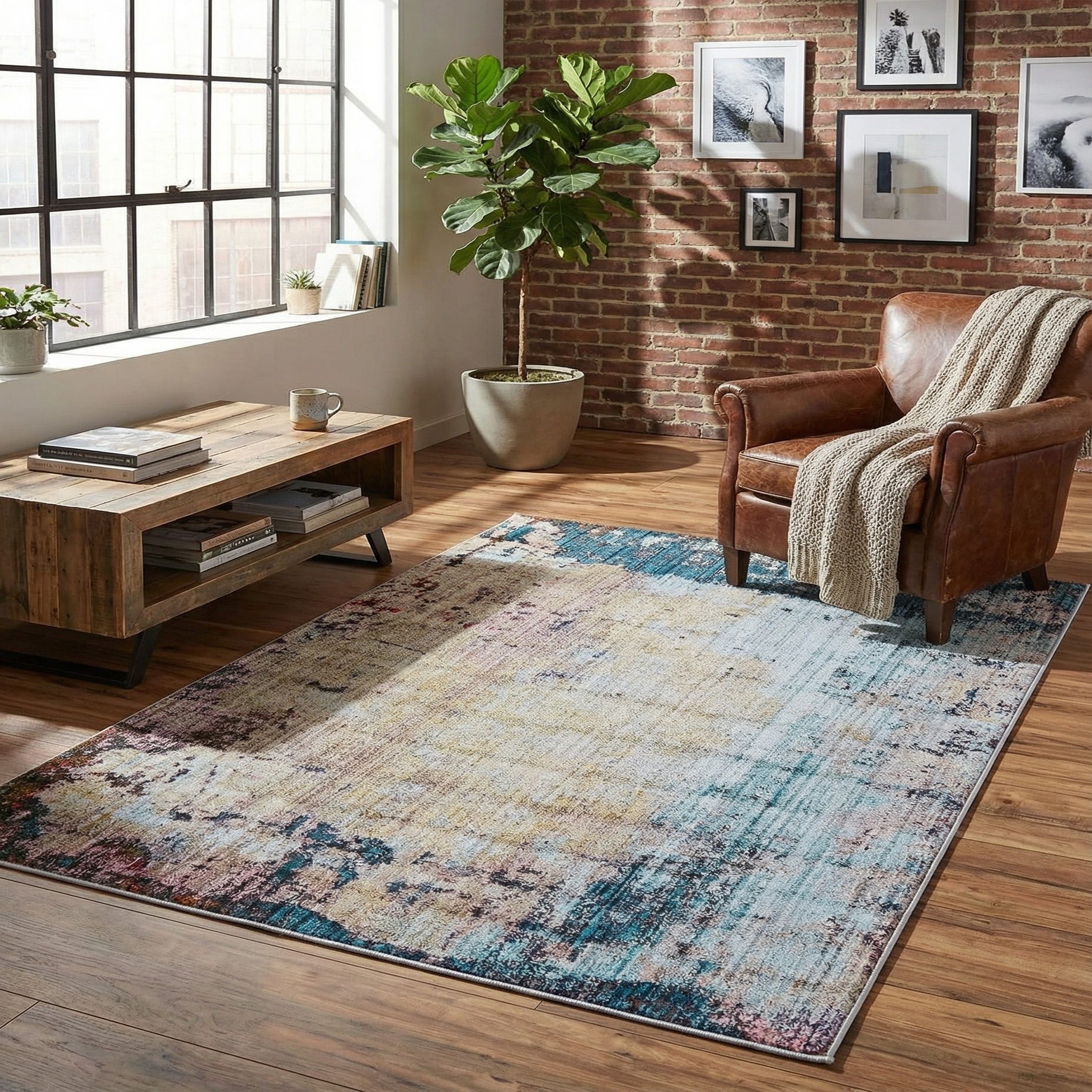 Use this rug to anchor a modern living room, a relaxed bedroom, or a home office where layered textures and color play are desired. It pairs well with neutral upholstery to introduce color without overwhelming the palette, or alongside navy and wood finishes to pick up the deeper blues and browns. The painterly pattern also complements industrial and mid-century furniture—place it beneath a seating group or at the foot of a bed to add visual interest and cohesive warmth.