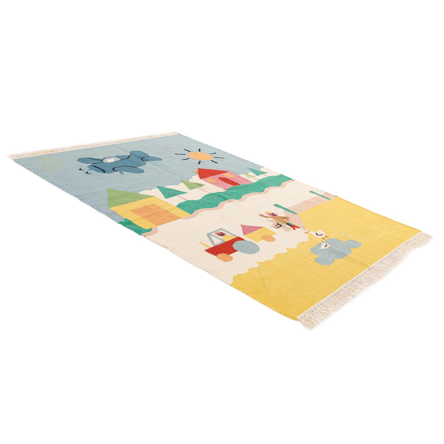 A colorful 4x6 flatweave wool rug depicting a playful village scene with a blue airplane, sun, houses, trees, a person with a dog, a tractor, and ducks on a pond.