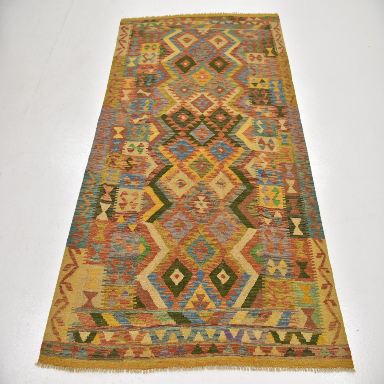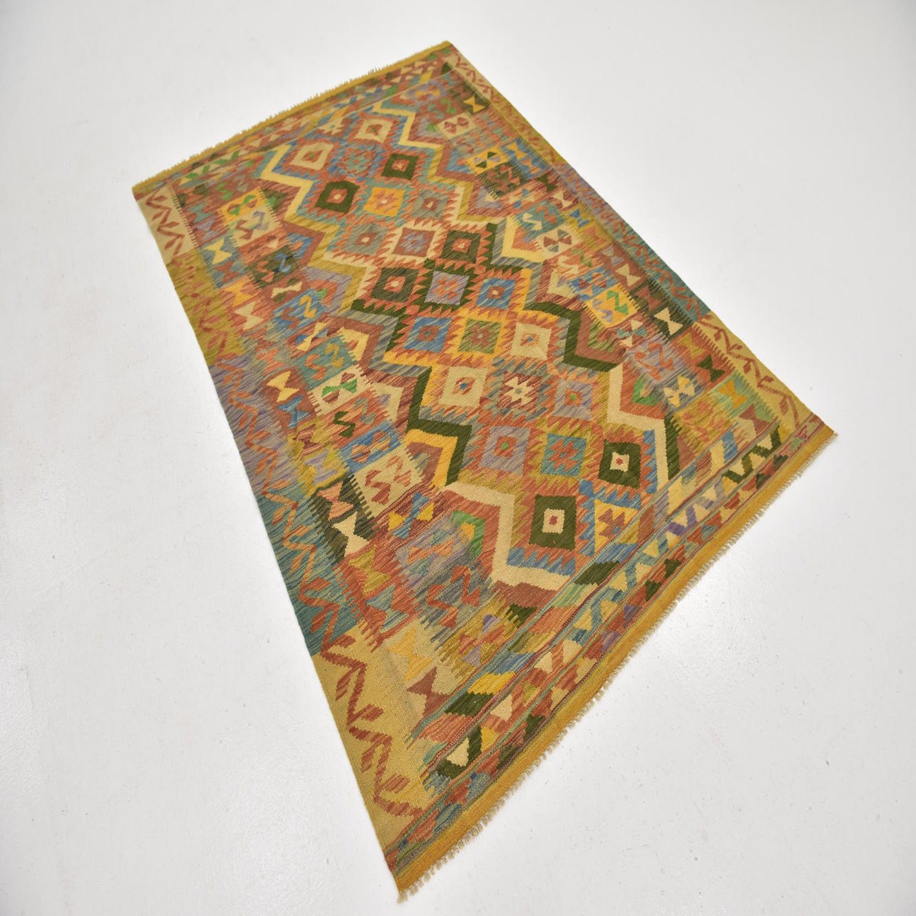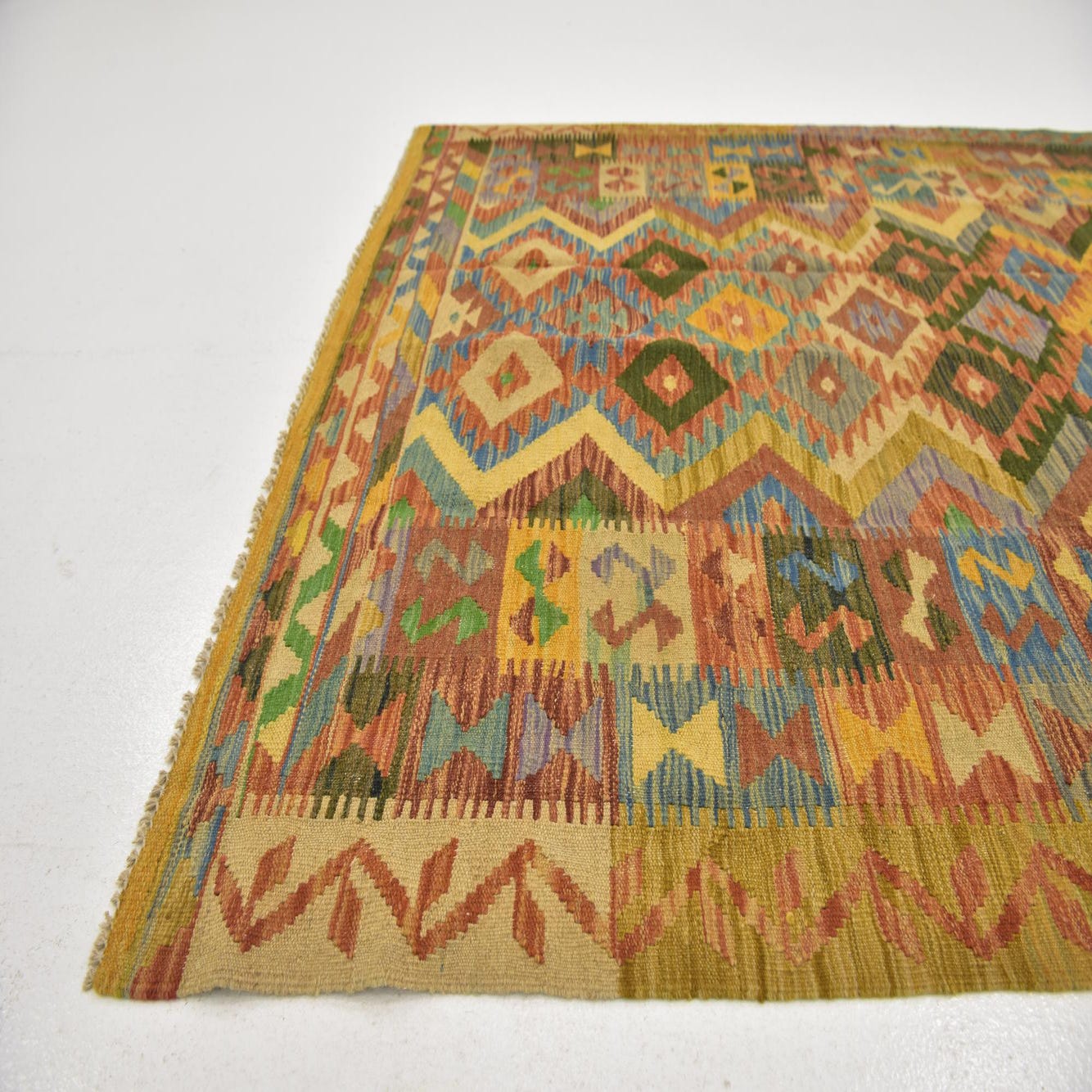 A 4x6 multi-colored rectangular Kilim Maymana wool rug with a vibrant tribal geometric pattern.