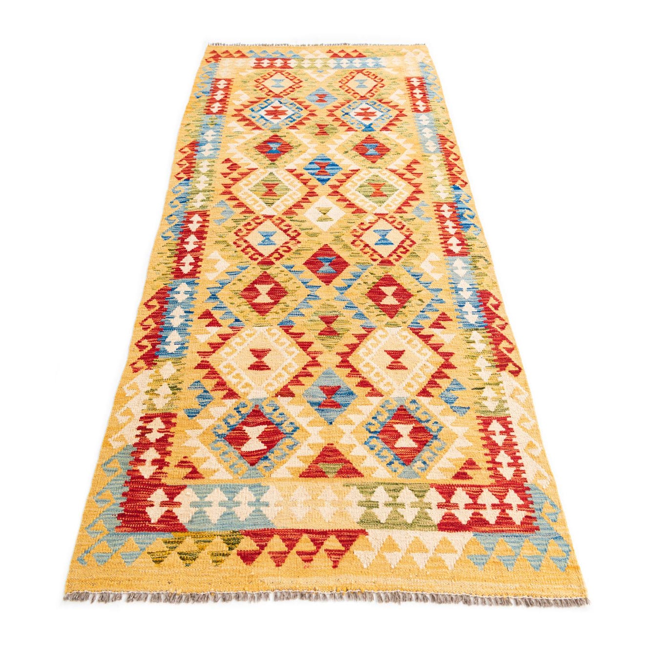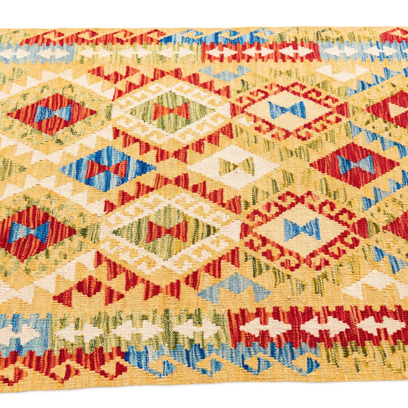 A 4x6 rectangular Kilim Maymana rug with a Southwestern tribal pattern in multi-colored wool, featuring red, blue, green, and cream geometric designs on a gold background.