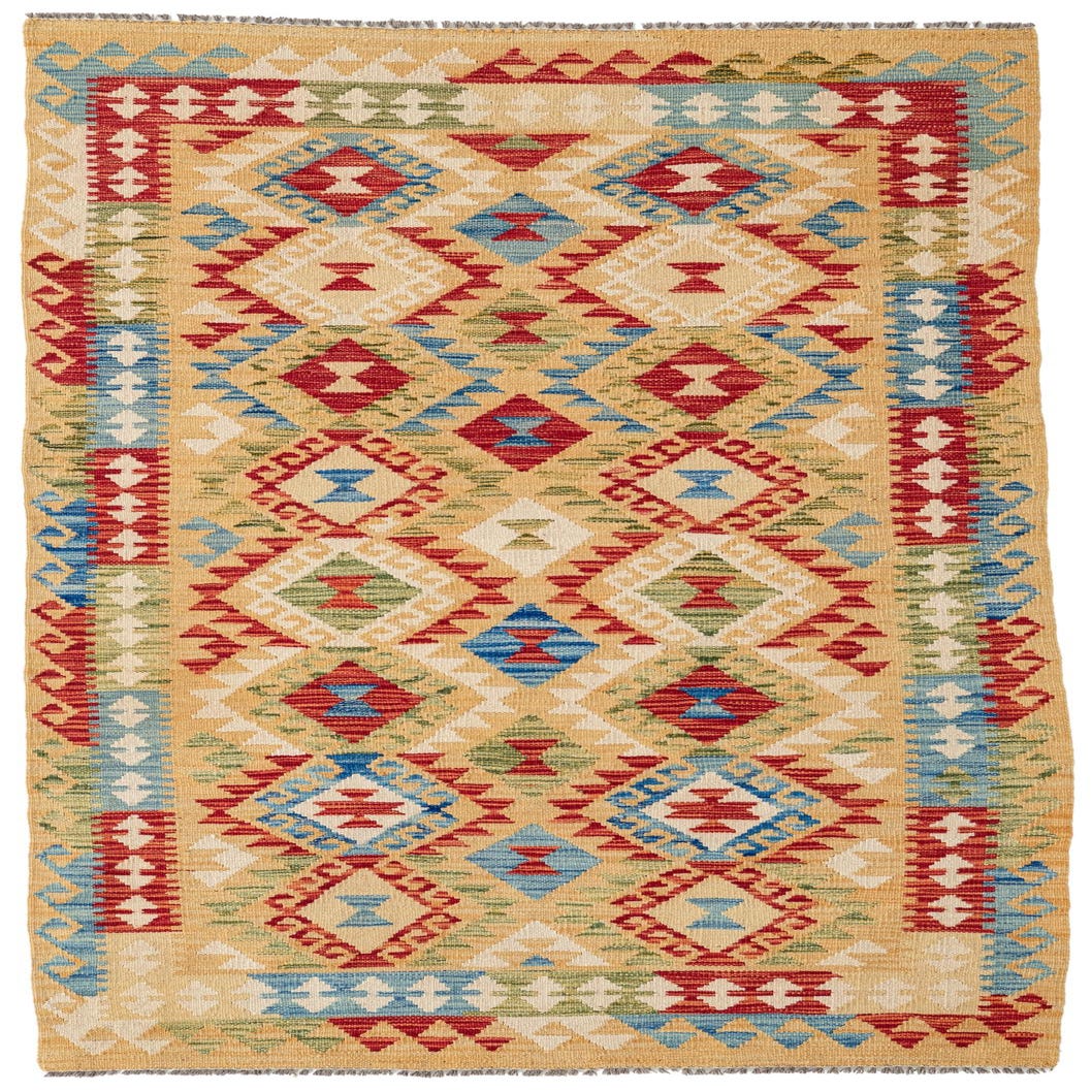 Hand-woven in 100% wool with a flatweave kilim construction, this rug presents a crisp geometric pattern of repeating diamond medallions and stepped tribal motifs set inside a patterned border. The surface is low-pile and tactile, with the woven weft creating a firm, textured feel underfoot. The palette is lively yet grounded — multi-tonal background woven from beige and tan hues with accents of blue, green, red, and ivory that give the pattern clear contrast and layered depth.