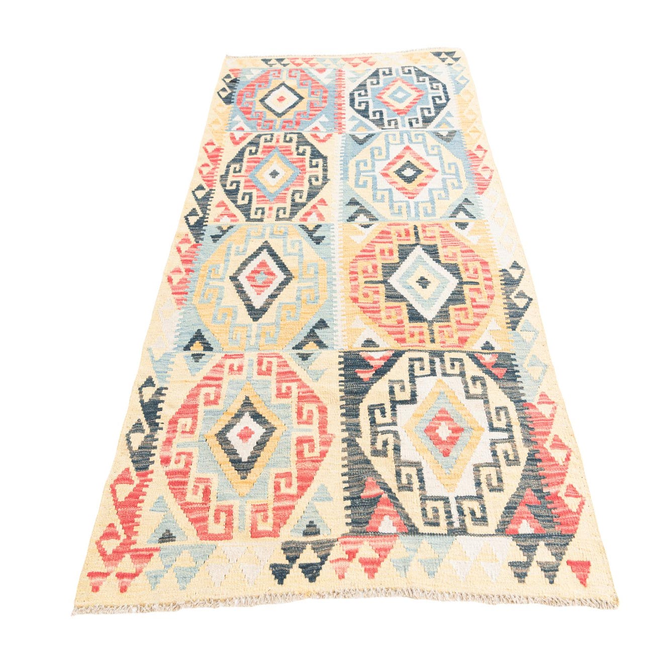 A 4x6 multi-colored Southwestern Kilim Maymana rug with a flatweave, featuring geometric patterns in yellow, red, blue, and black.