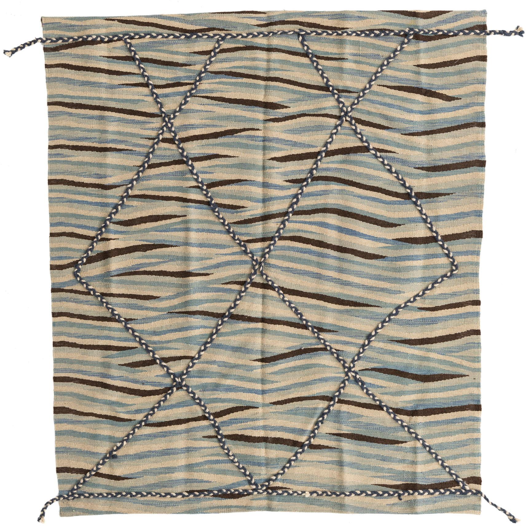 A 4x6 rectangular Kilim Modern wool rug with horizontal stripes in shades of blue, cream, and brown, overlaid with a braided blue diamond pattern.