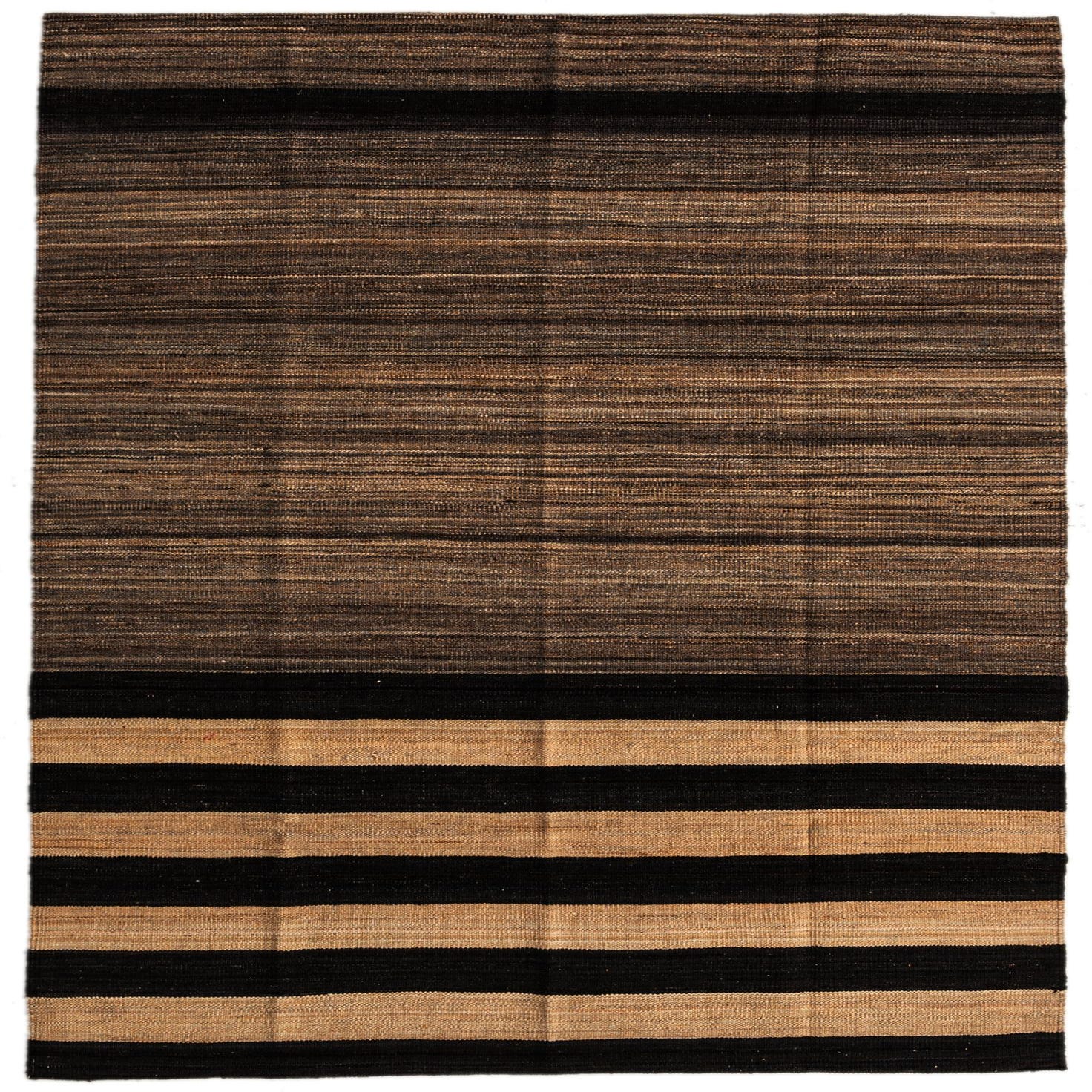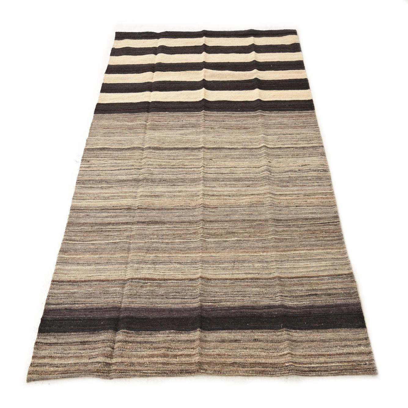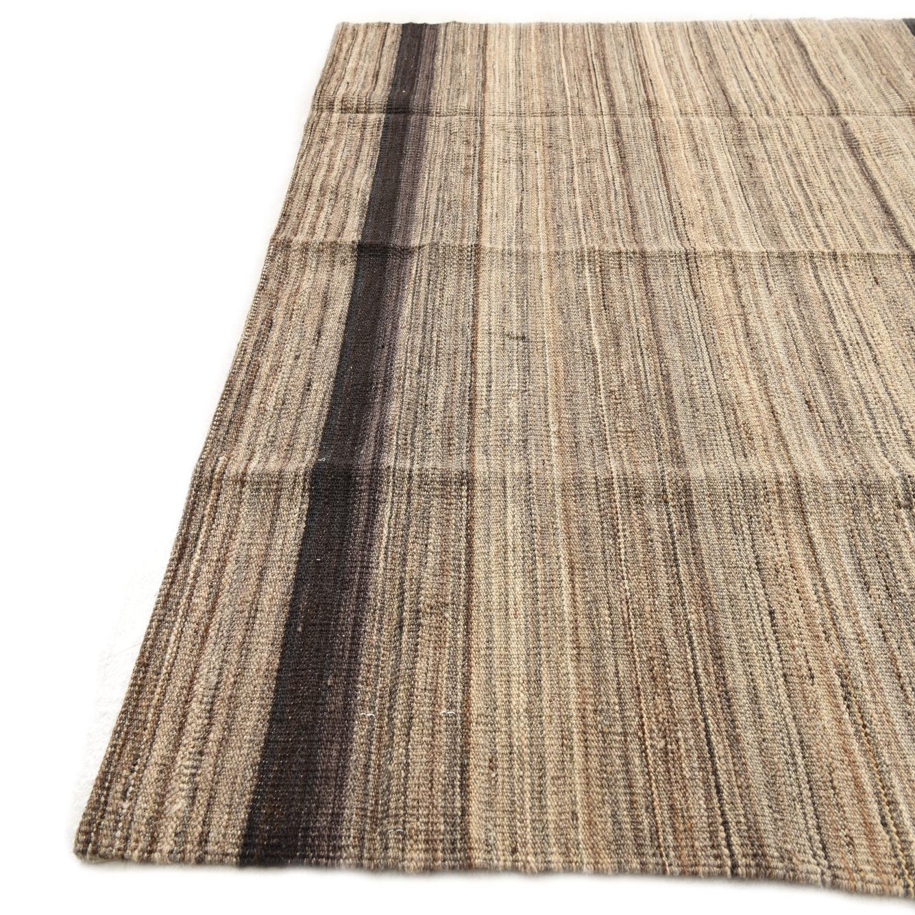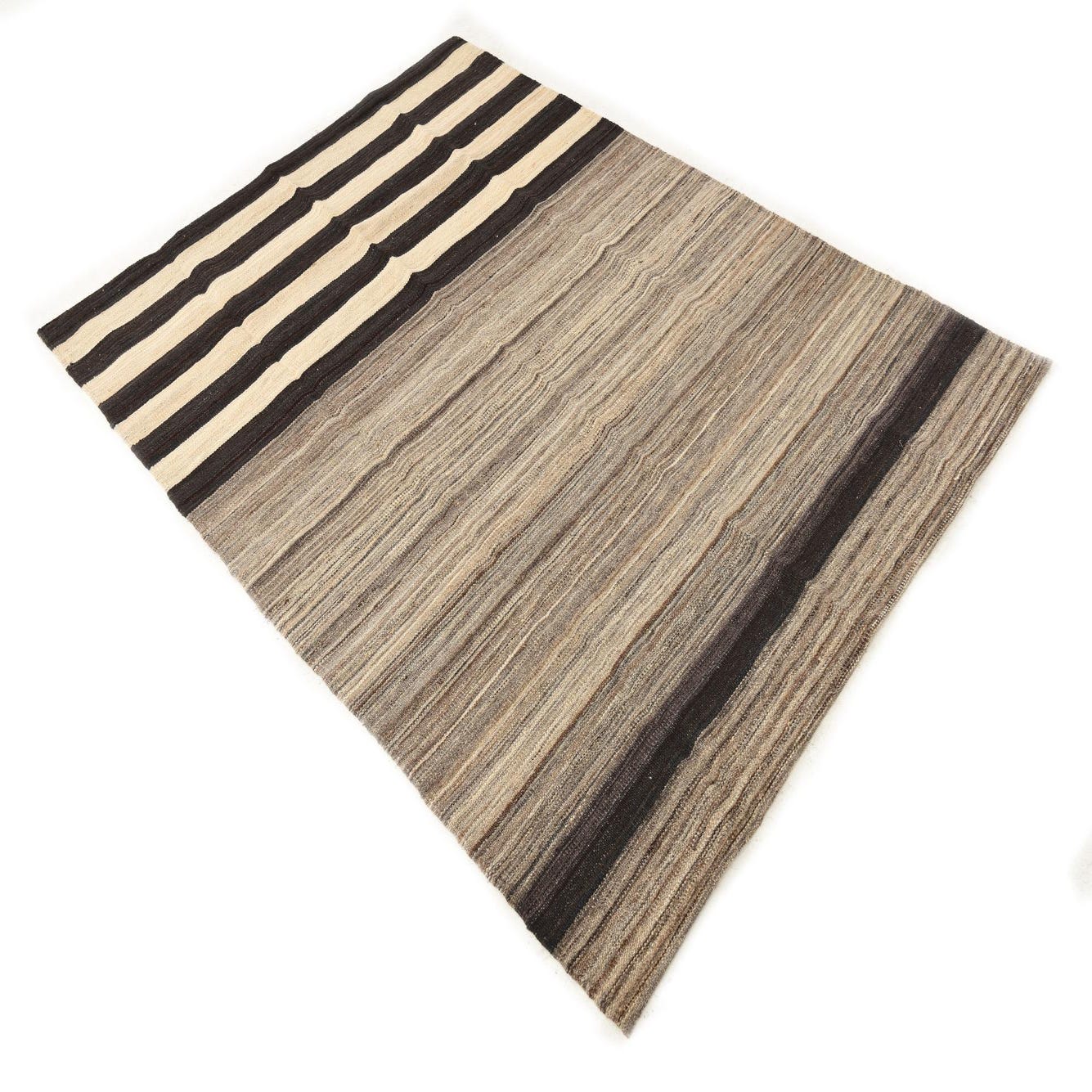 A 4x6 rectangular Kilim Modern rug with a flatweave, featuring a multi-colored striped pattern in black and natural brown tones.