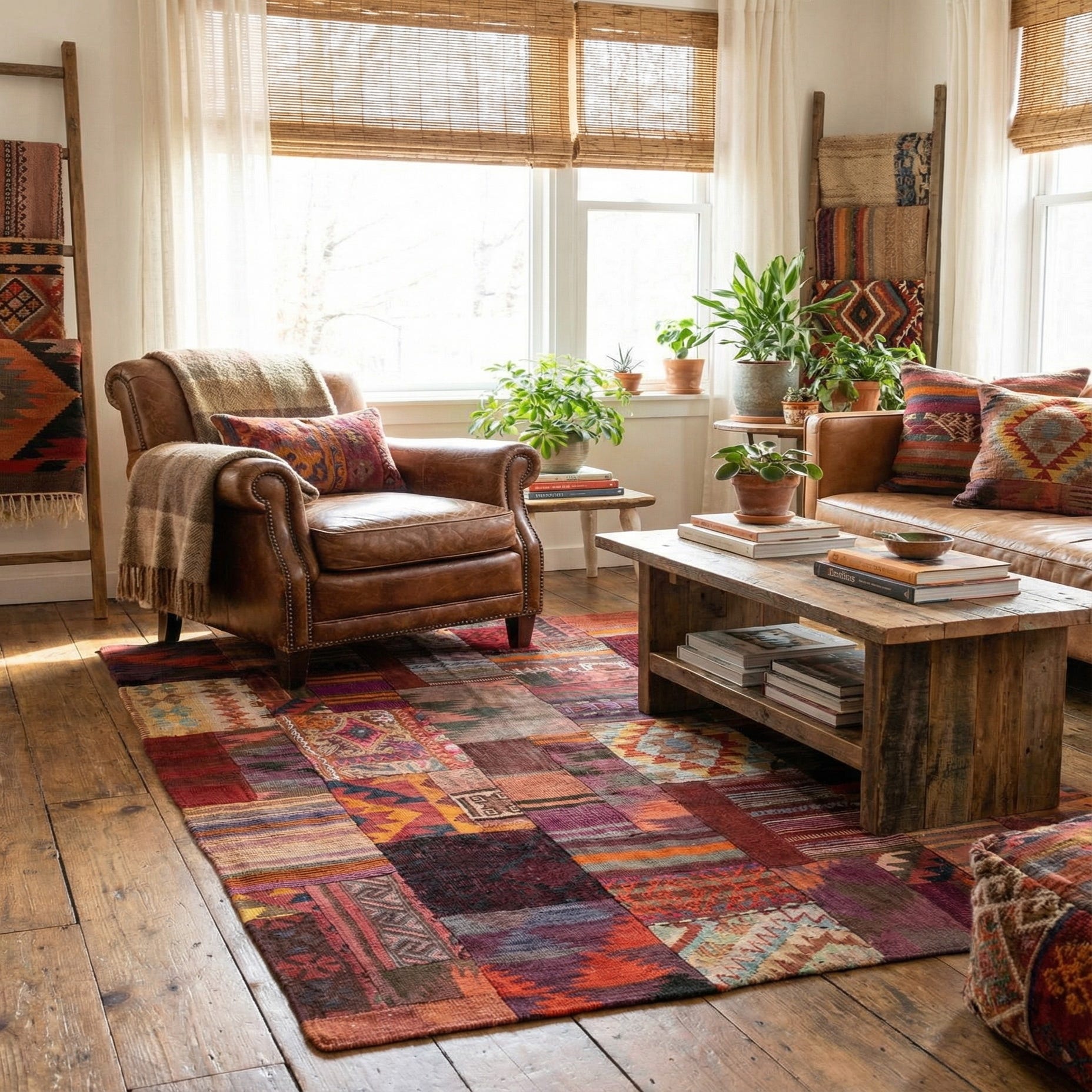 A notable choice for a living area, this Kilim Patchwork rug will harmonize with natural materials such as wood and leather, and will act as a focal point in a minimalist space. In a study or office, it can bring warmth and inspire creativity with its intricate designs and storytelling elements.