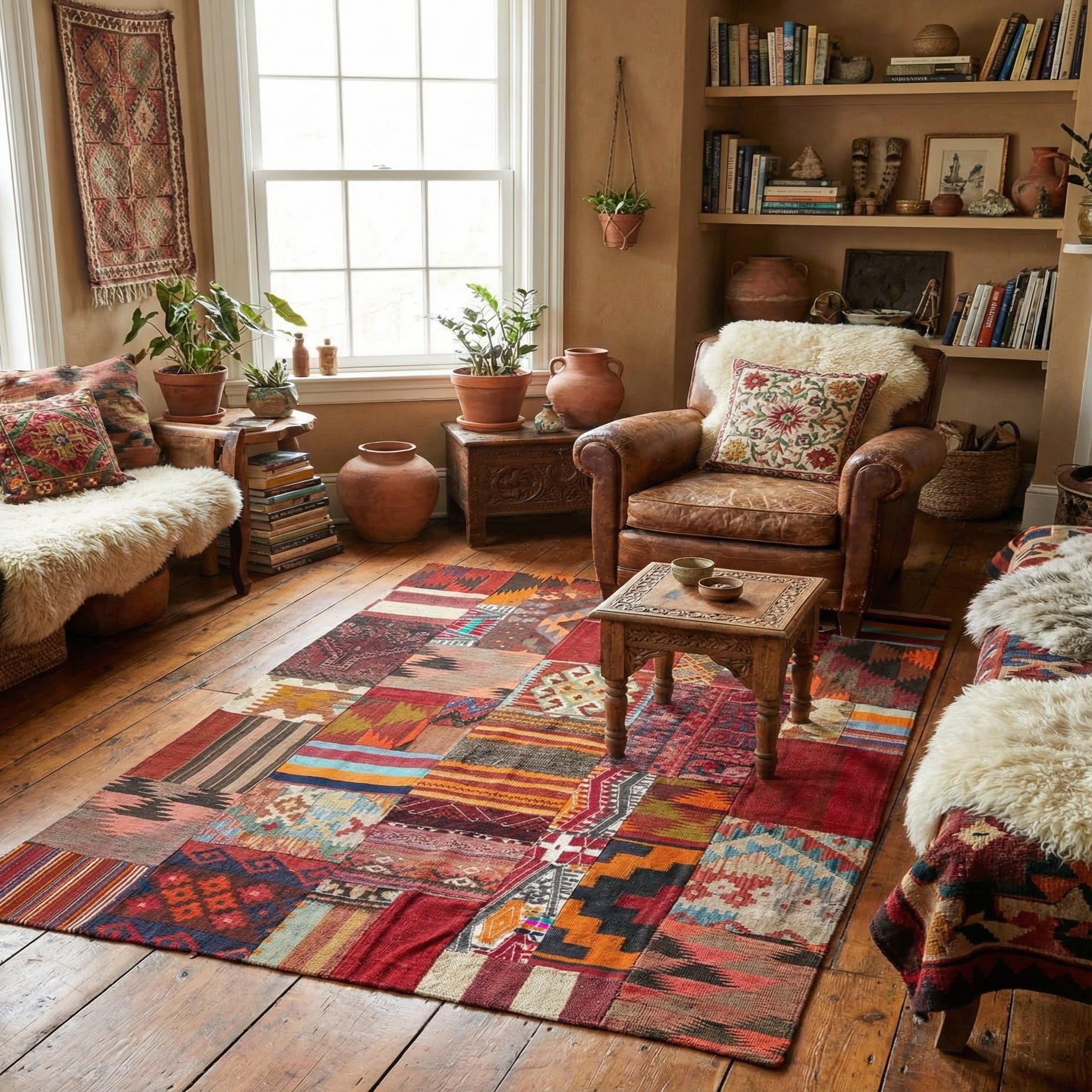 A 4x6 multi-colored Kilim Patchwork rug with various tribal, geometric, and striped patterns, showcasing its flatweave texture.