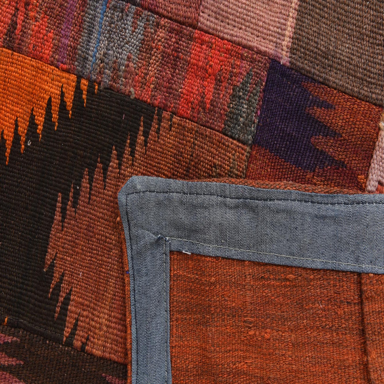The varying textures across the patchwork contribute to its unique aesthetic, offering a visual and tactile experience. The flat-woven nature of kilim rugs presents a low pile that is both easy to maintain and versatile for a variety of settings.