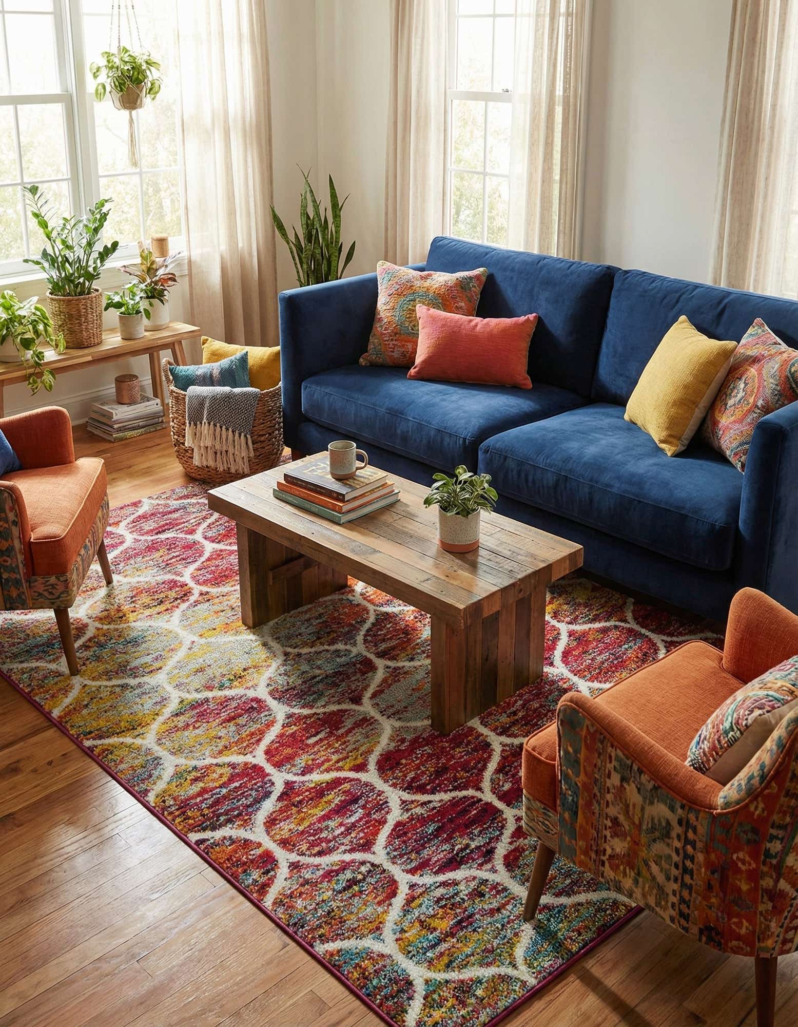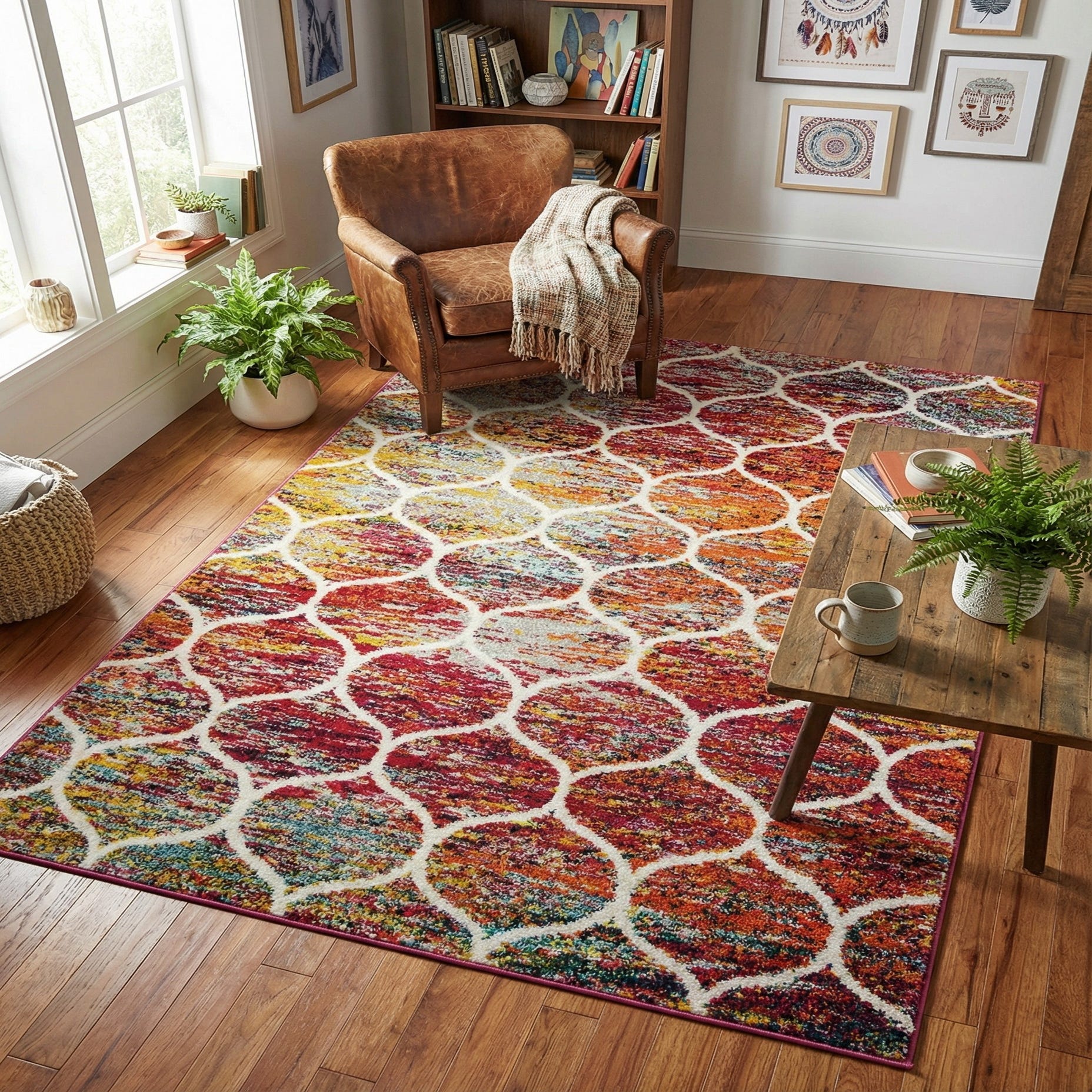 This colorful, contemporary piece works well where you want a bold focal point without overwhelming the room: layer it beneath a modern sofa to energize a living area, place it at an entry or bedside to introduce instant color, or use it under a small dining set or in a home office to warm the floor. Pair it with warm woods and simple, neutral upholstery to let the colors sing, or combine it with mixed textiles and eclectic accents for a more bohemian, collected look.