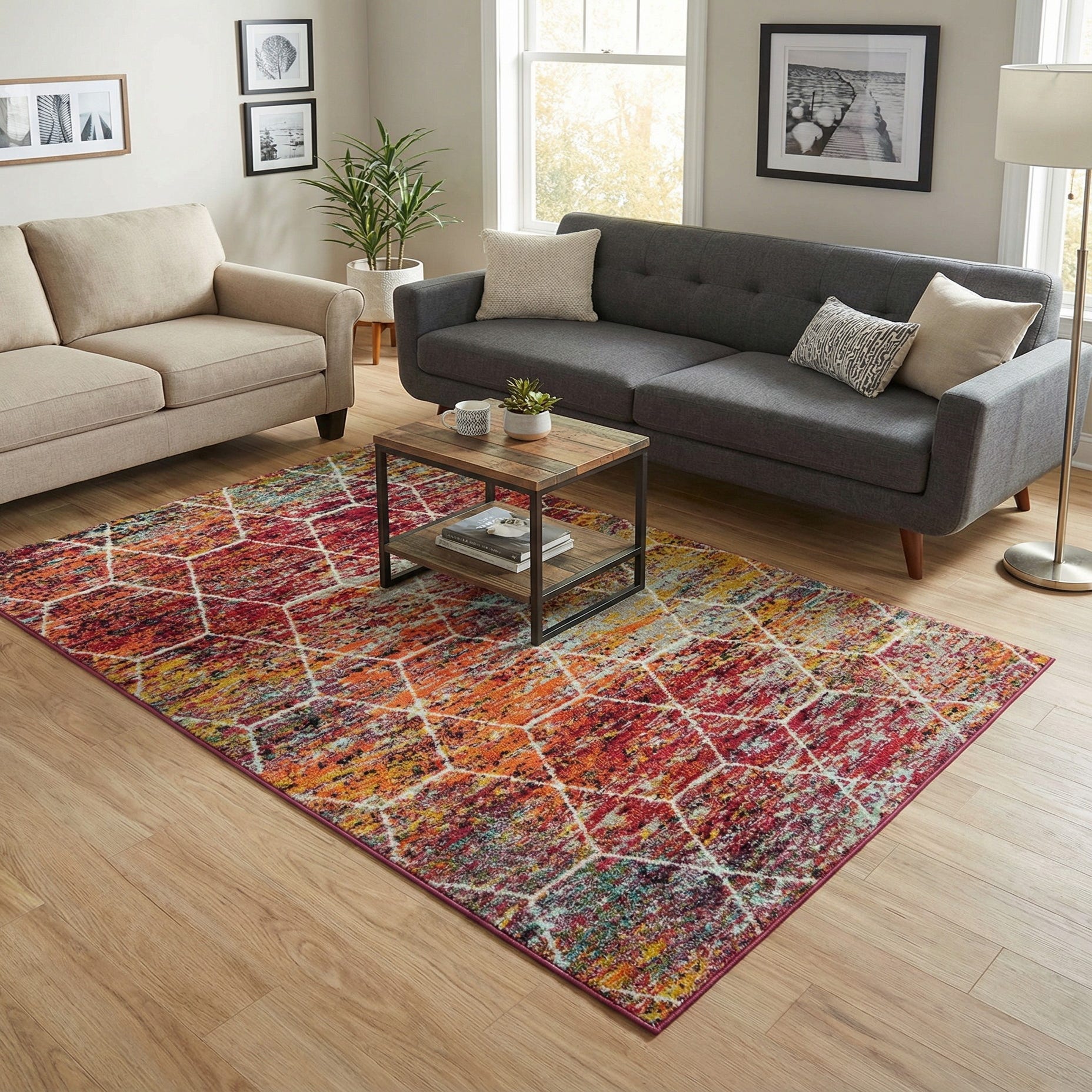 Pair this rug with neutral sofas or solid wood furniture to let the colors take center stage, or layer it into a bohemian or eclectic scheme with mixed textiles and metallic accents. It works well in smaller living areas, bedrooms, entryways or home offices where a burst of color and geometric structure will anchor the space.