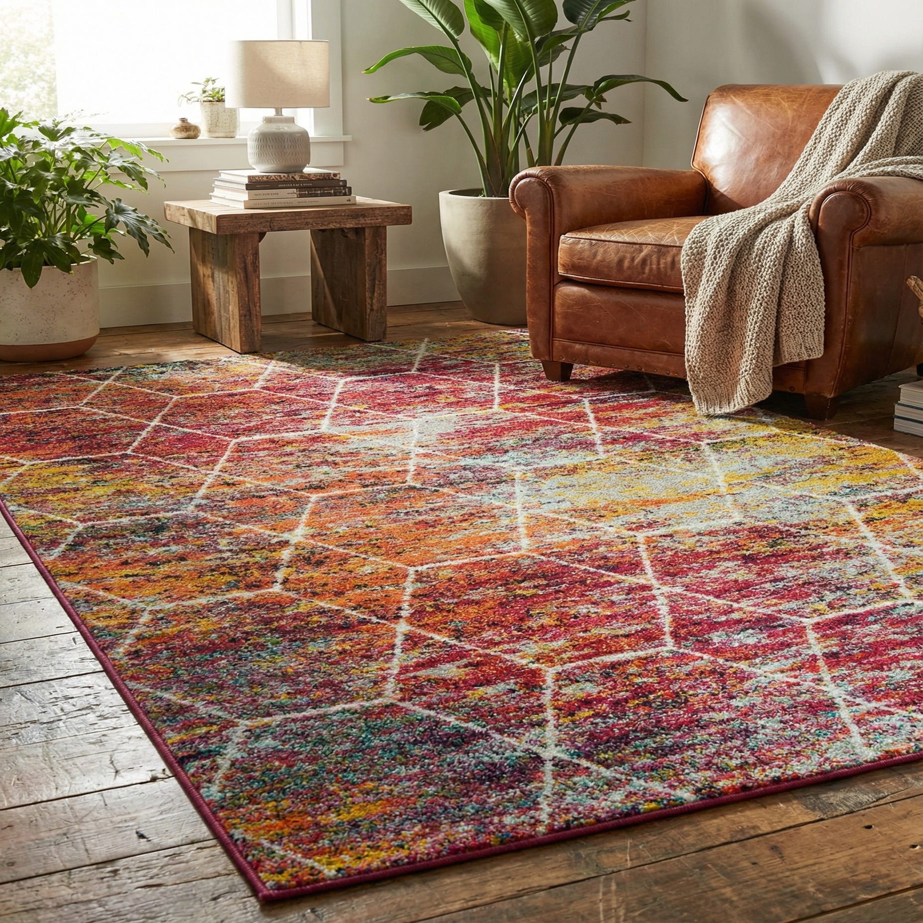 A vibrant 4x6 multi-colored rectangular rug featuring a modern trellis pattern with white geometric hexagons over a distressed background.