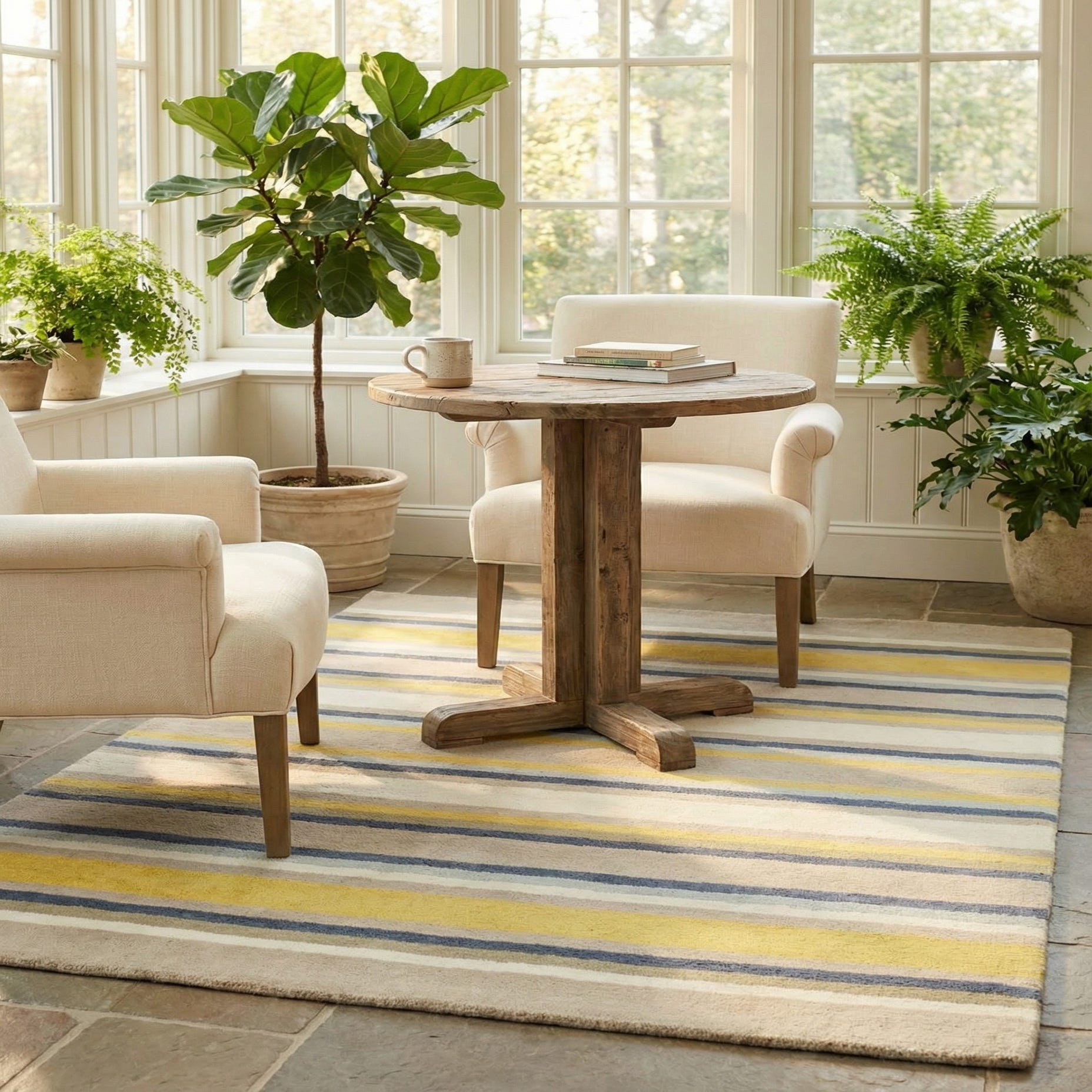 A 4x6 rectangular Luna rug featuring horizontal stripes in varying widths of yellow, grey, off-white, and dark blue.