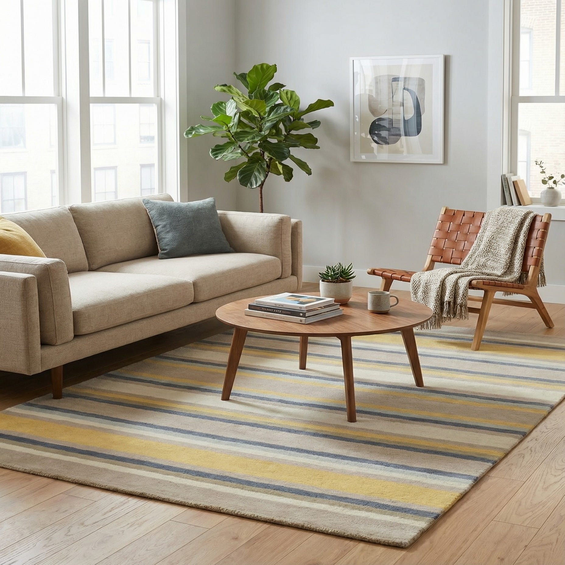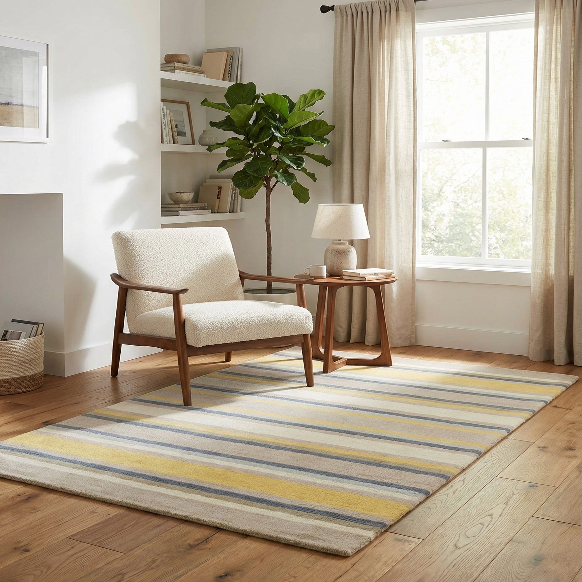 A 4x6 rectangular Luna rug featuring horizontal stripes in varying widths of yellow, grey, off-white, and blue.