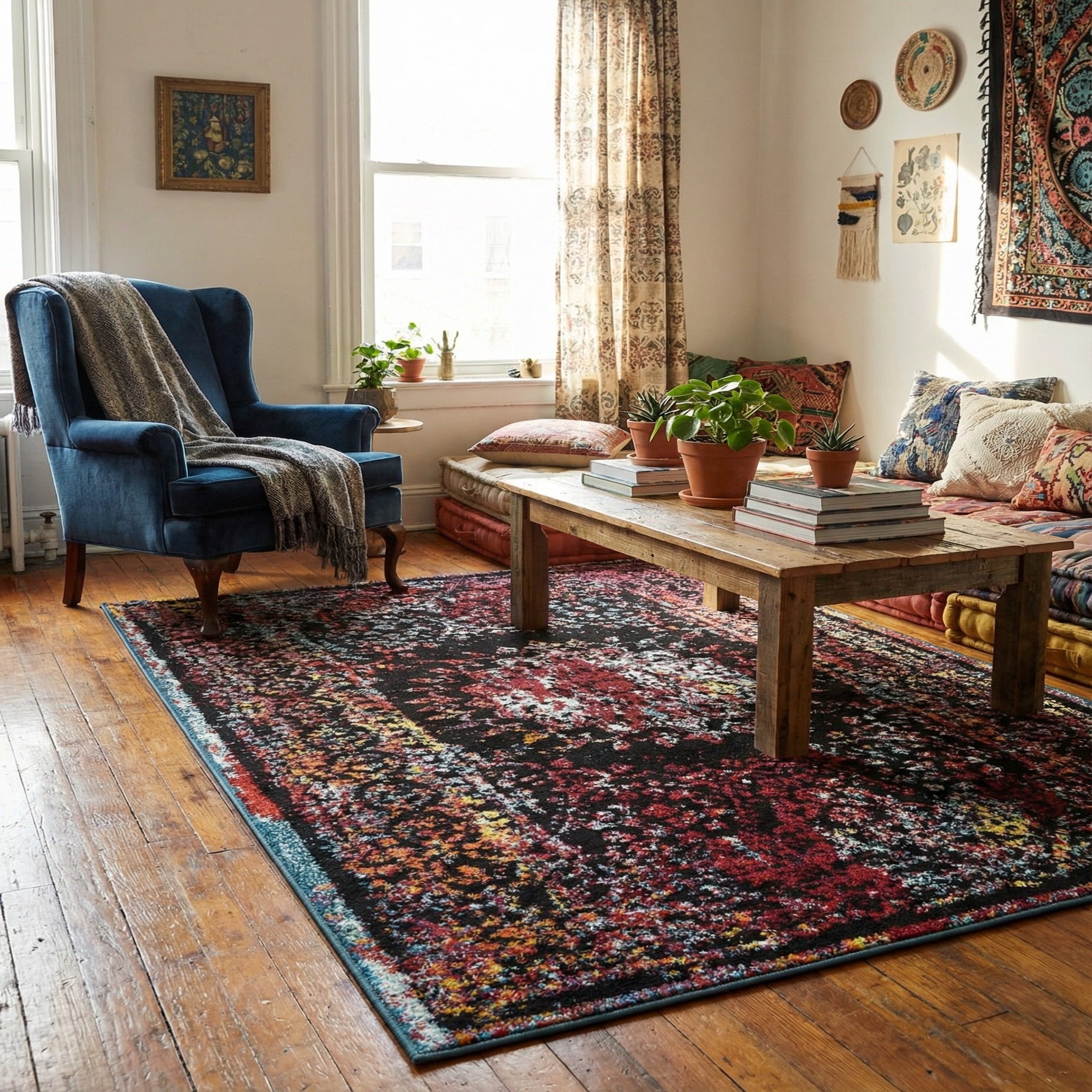 Primary color is Multi. Colors in this rug include: Multi, Blue, Ivory, Light Blue, Navy Blue, Red, Yellow, Orange, Purple, Teal, Pink.