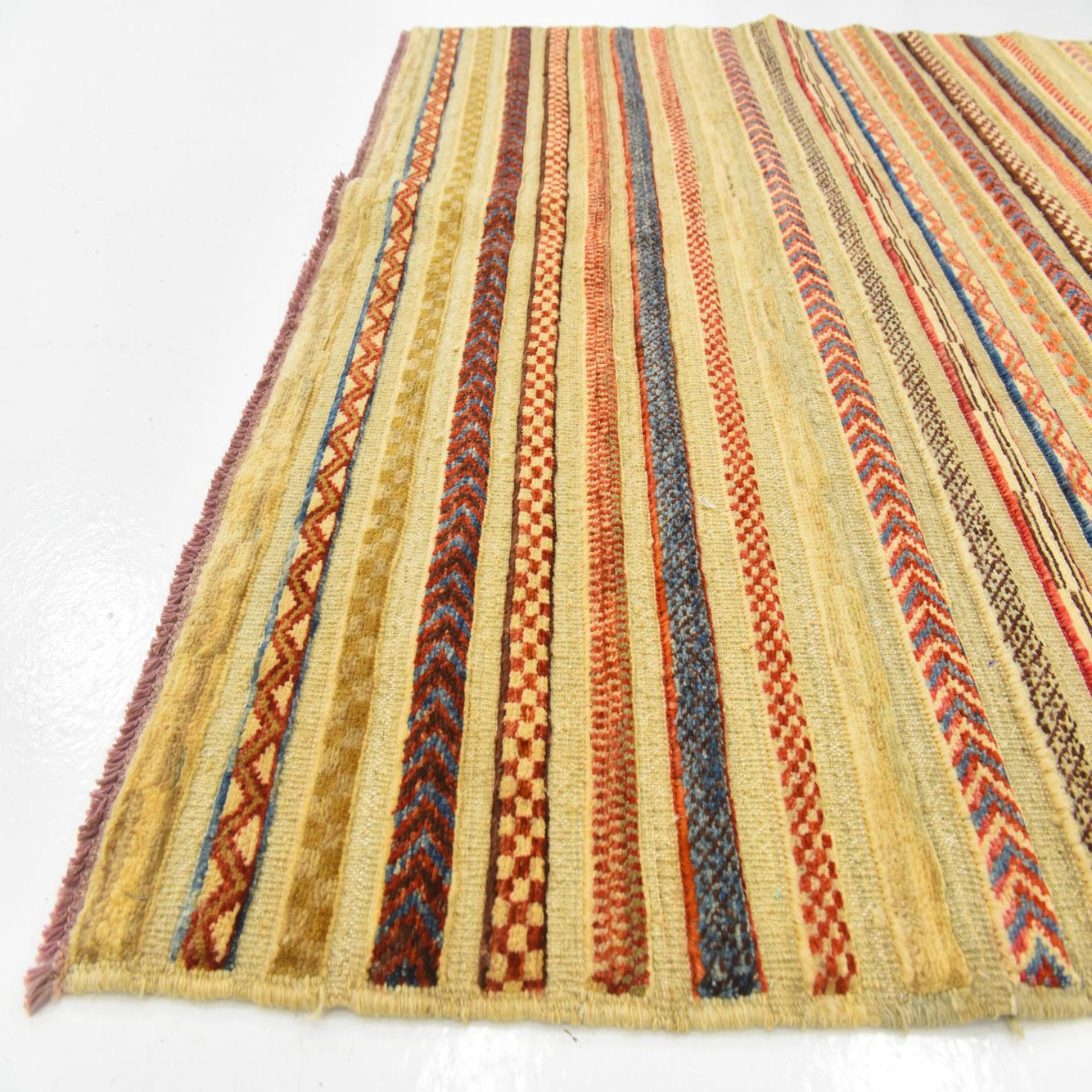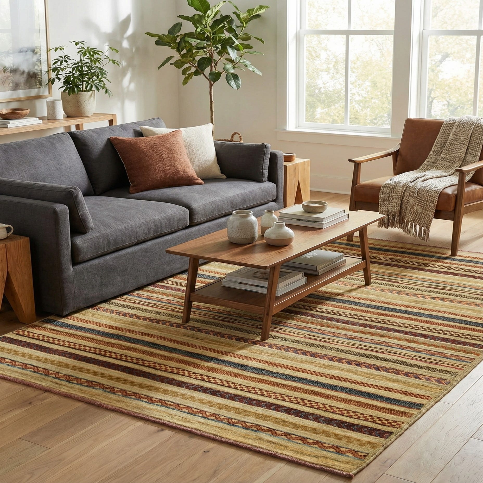 A 4x6 rectangular multi-colored Southwestern area rug with varied horizontal stripes in earthy tones, suitable for a living room.