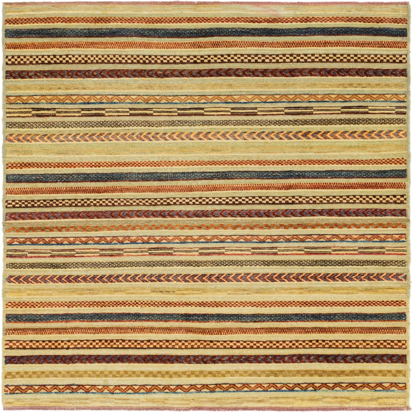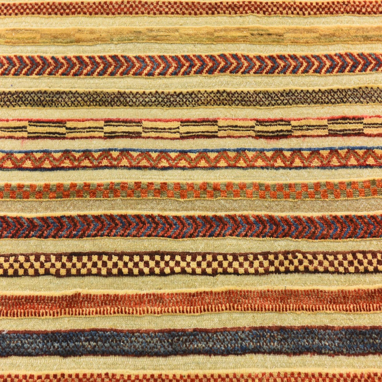 Bands of patterned stripes cross this rug in a warm, grounded palette. Repeating chevrons, tiny checks, braided rows and narrow solid lines alternate across a multi background in shades of cream, beige, tan and gold punctuated by blue, brown, orange, peach and red. The motifs are arranged with a measured rhythm that gives the rug visual texture without overwhelming a room, while the mix of warm and cool tones makes it easy to layer with other finishes.