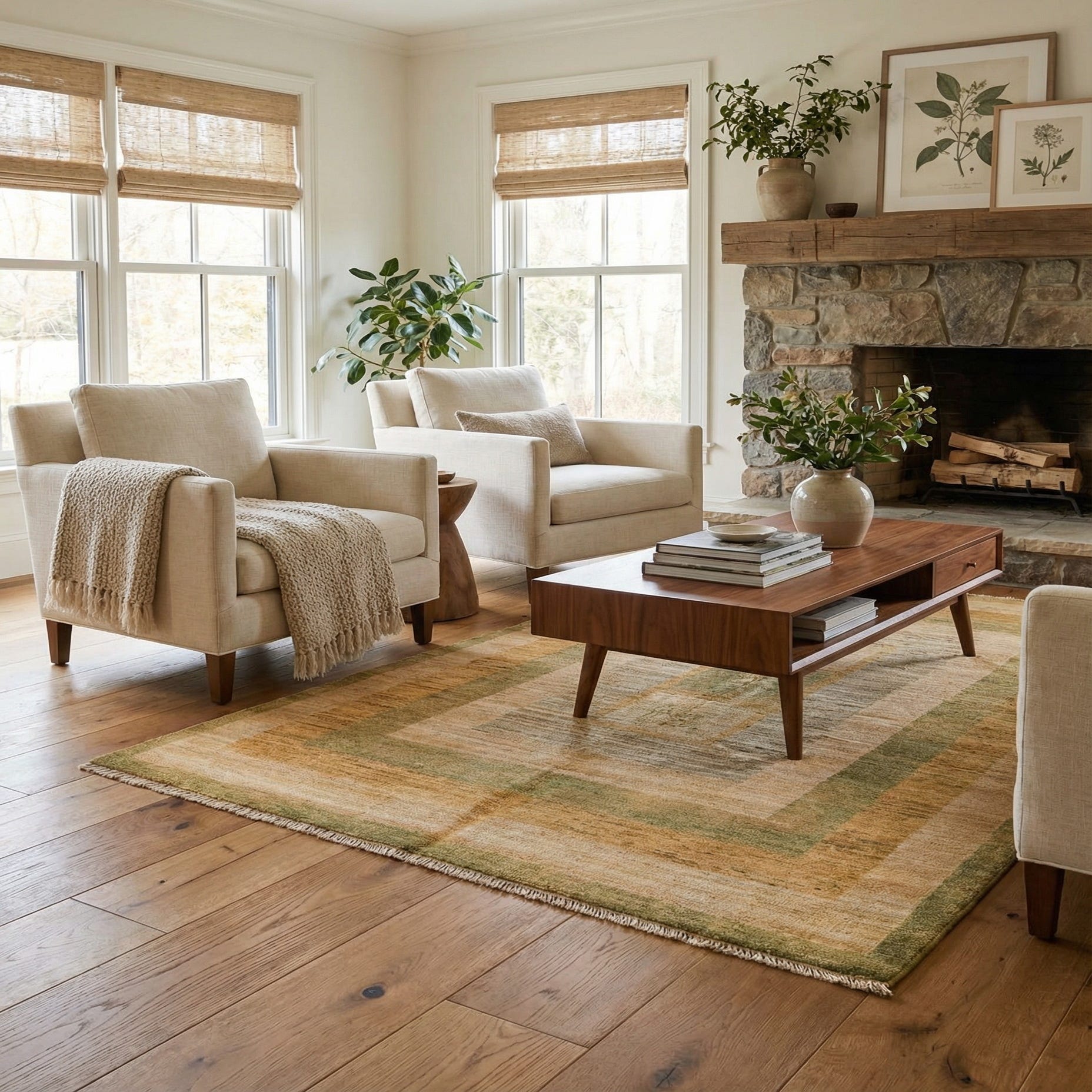 This rug would integrate seamlessly into decor scenarios that favor contemporary and transitional styles. It can serve as a statement piece in a minimalist setting or complement a room with natural wood elements and earth-tone accents. Its refined color palette would also allow it to sit comfortably in a home office or a cozy nook, providing visual warmth and textural interest.