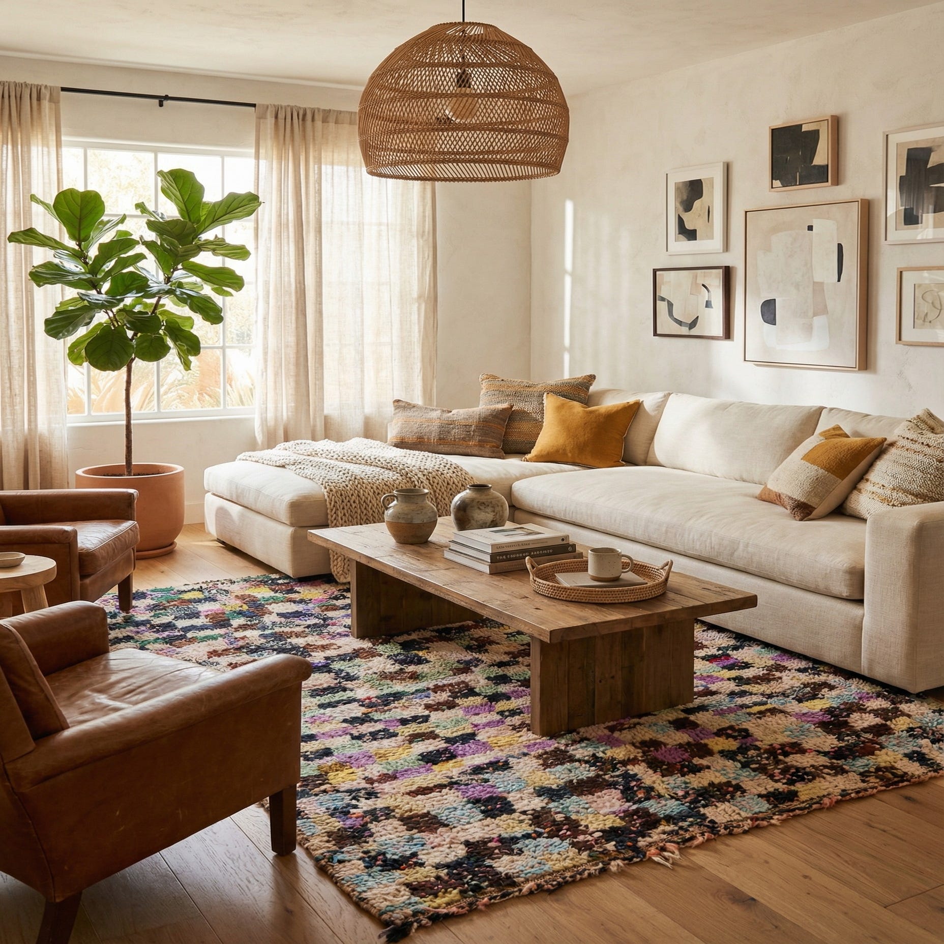 Primary color is Multi. Colors in this rug include: Multi, Beige, Blue, Brown, Green, Violet, Yellow.