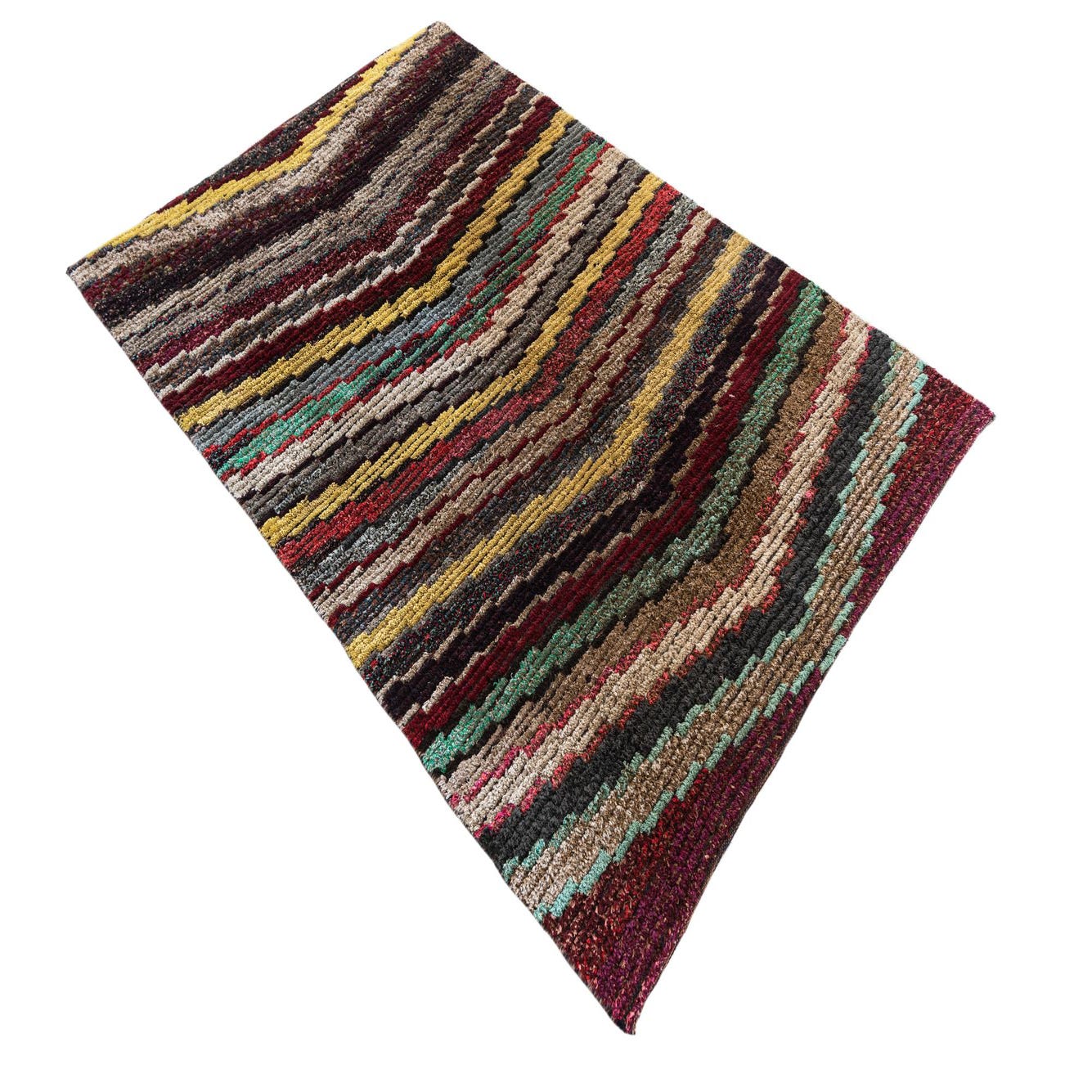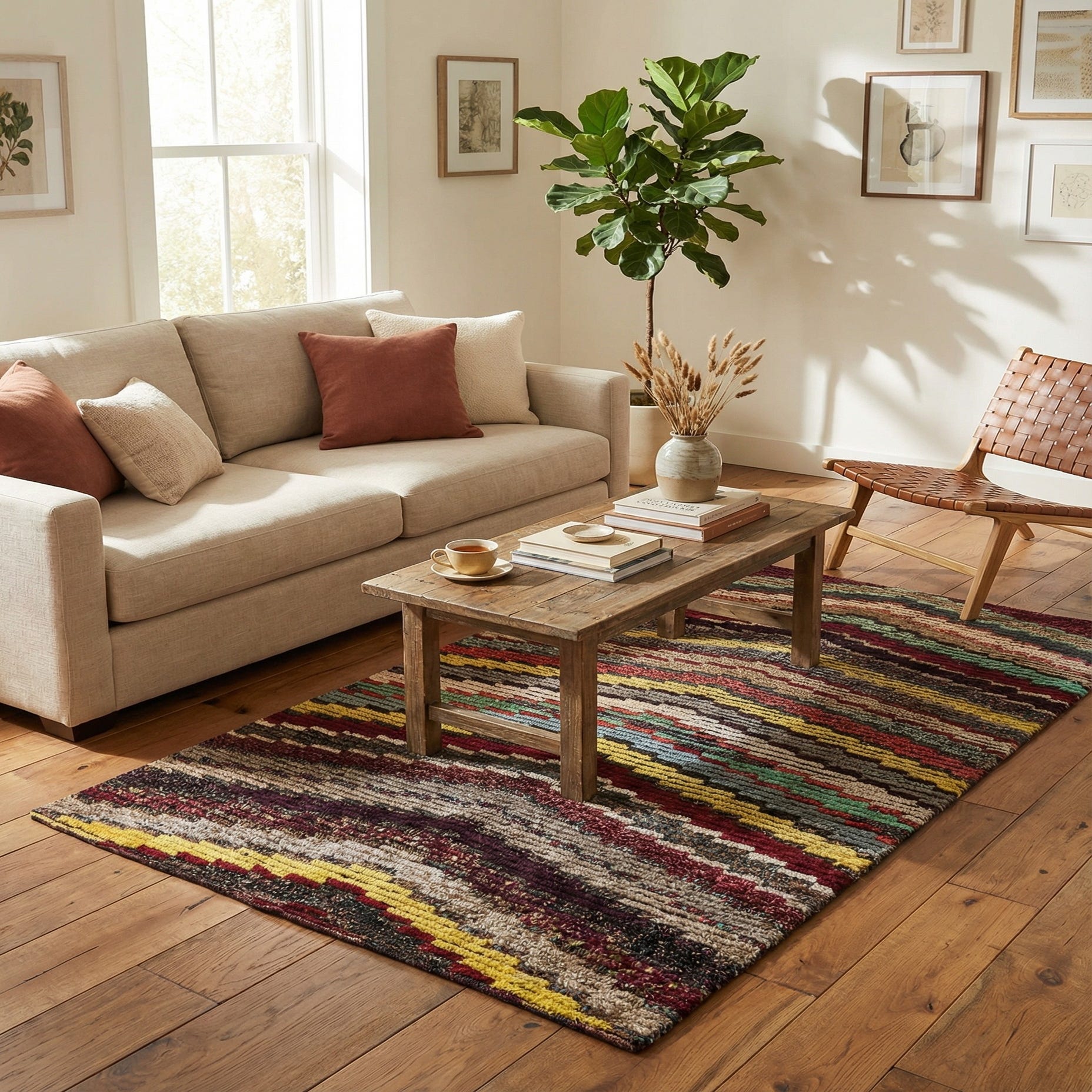 This rug suits a variety of interiors: place it beneath a coffee table to anchor an eclectic living room, slide it into a cozy reading nook to warm natural wood floors, or layer it in an entryway as a colorful welcome. It pairs well with warm leathers and mid-century silhouettes, rich jewel-toned accents, or a neutral sofa and bold wall art for contrast.