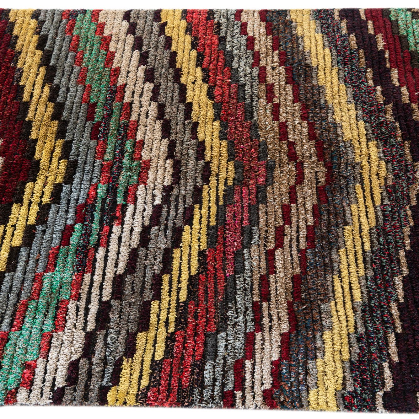 A lively, stepped chevron pattern runs across this hand-knotted 100% wool rug, creating layered V-shaped bands that draw the eye while maintaining a grounded rhythm. The multi background supports a palette of beige, blue, brown, burgundy, green, red, yellow and light green, with each hue appearing in short, stacked strokes that give the design a woven, almost pixelated quality. The wool pile is dense and tactile—soft underfoot with a subtle nubby surface that adds depth and a handcrafted character to the texture.