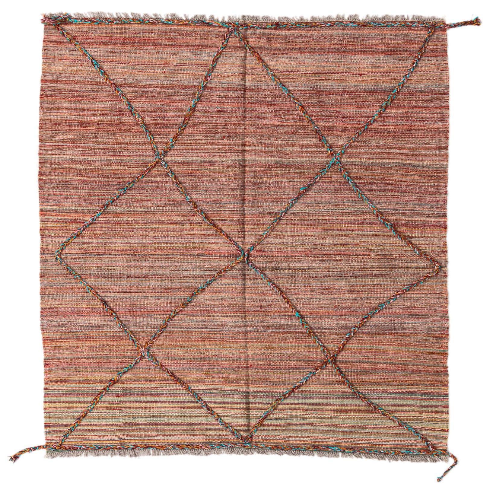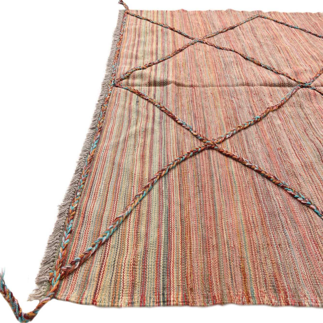 A 4x6 multi-colored rectangular wool shag rug with a tribal diamond pattern made from braided ropes.