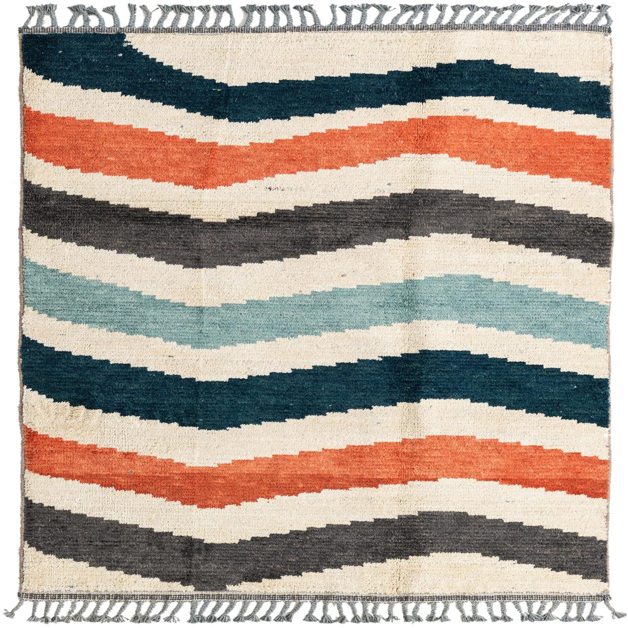 A 4x6 rectangular shag rug with a bold, multi-colored tribal wave pattern in cream, teal, orange, and dark gray, featuring tassels.