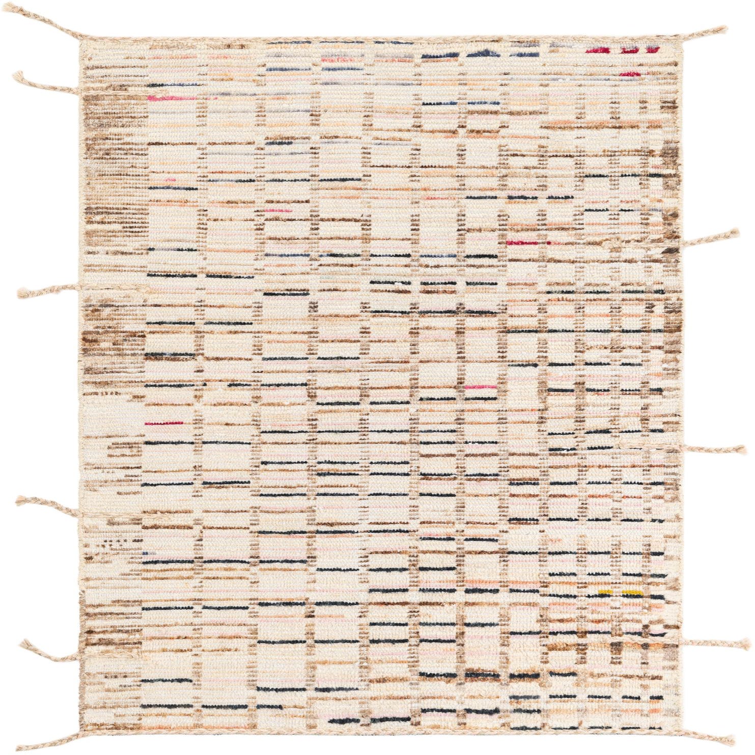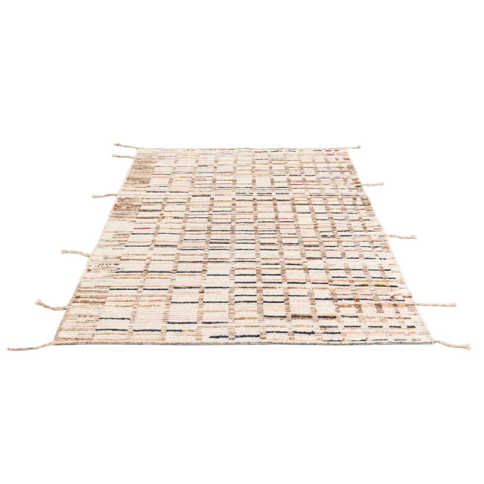 Hand-knotted of 100% wool, this rug presents a multi-toned background woven with a loose, grid-like pattern of short dashes and strokes in beige, black, brown, red, and cream. The design balances an orderly lattice with irregular, hand-crafted marks and subtle pops of red that energize the otherwise warm, neutral palette. The surface has a low-to-medium pile with a pleasantly cushioned feel and slight textural variation from the hand-knotting; knotted fringe along the sides adds a casual, tactile finishing detail.