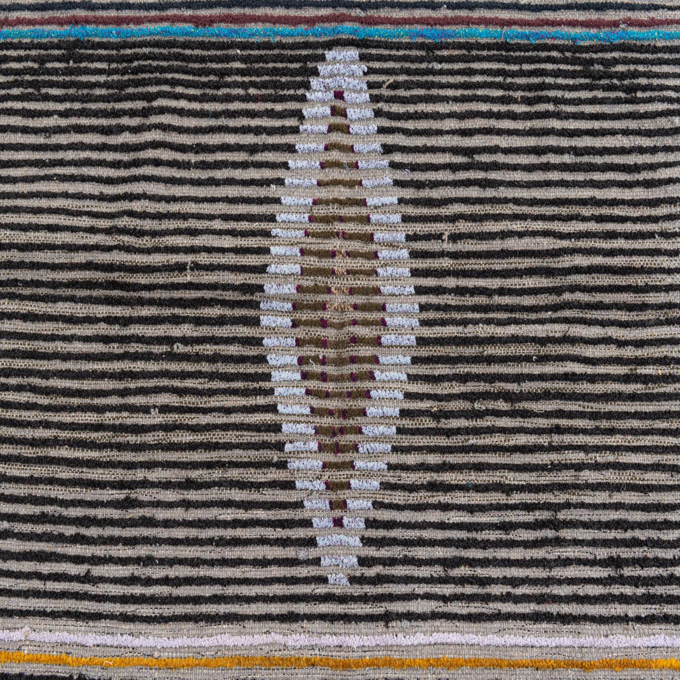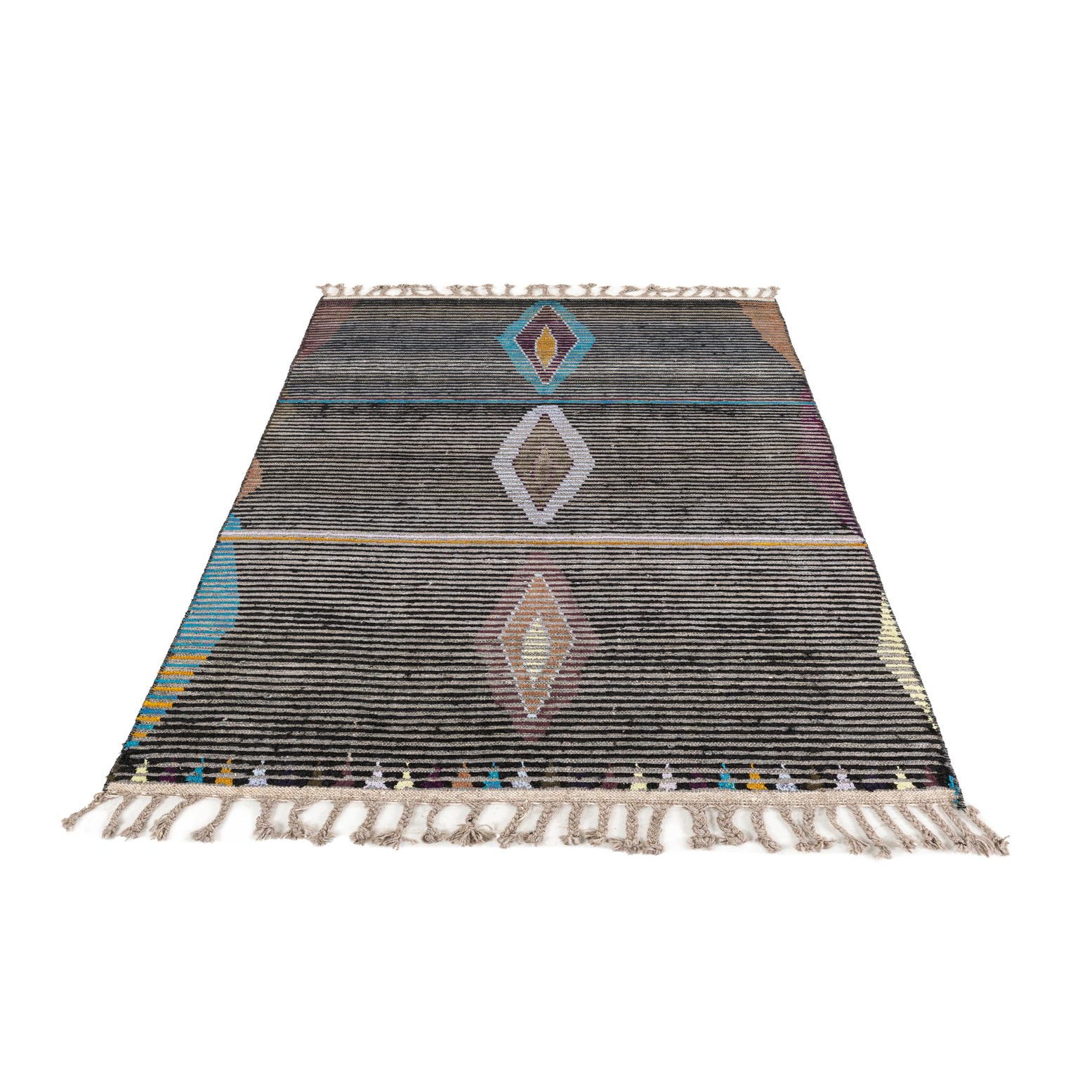 A 4x6 rectangular multi-colored wool shag rug with tribal diamond patterns and tassels, ideal for a living room.