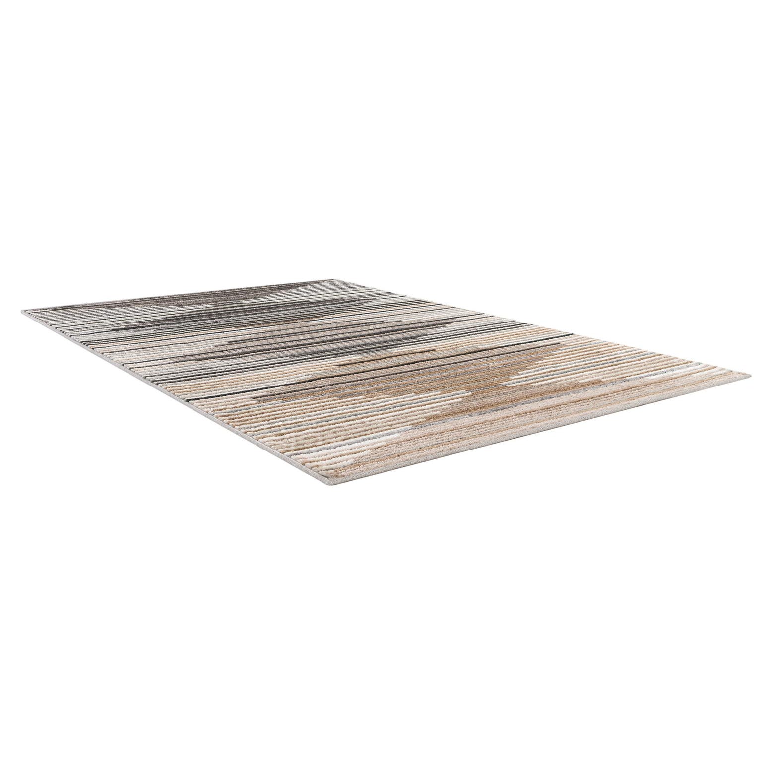 A 4x6 rectangular Odyssey rug with a modern geometric pattern in multi-colored stripes of black, grey, white, and brown.