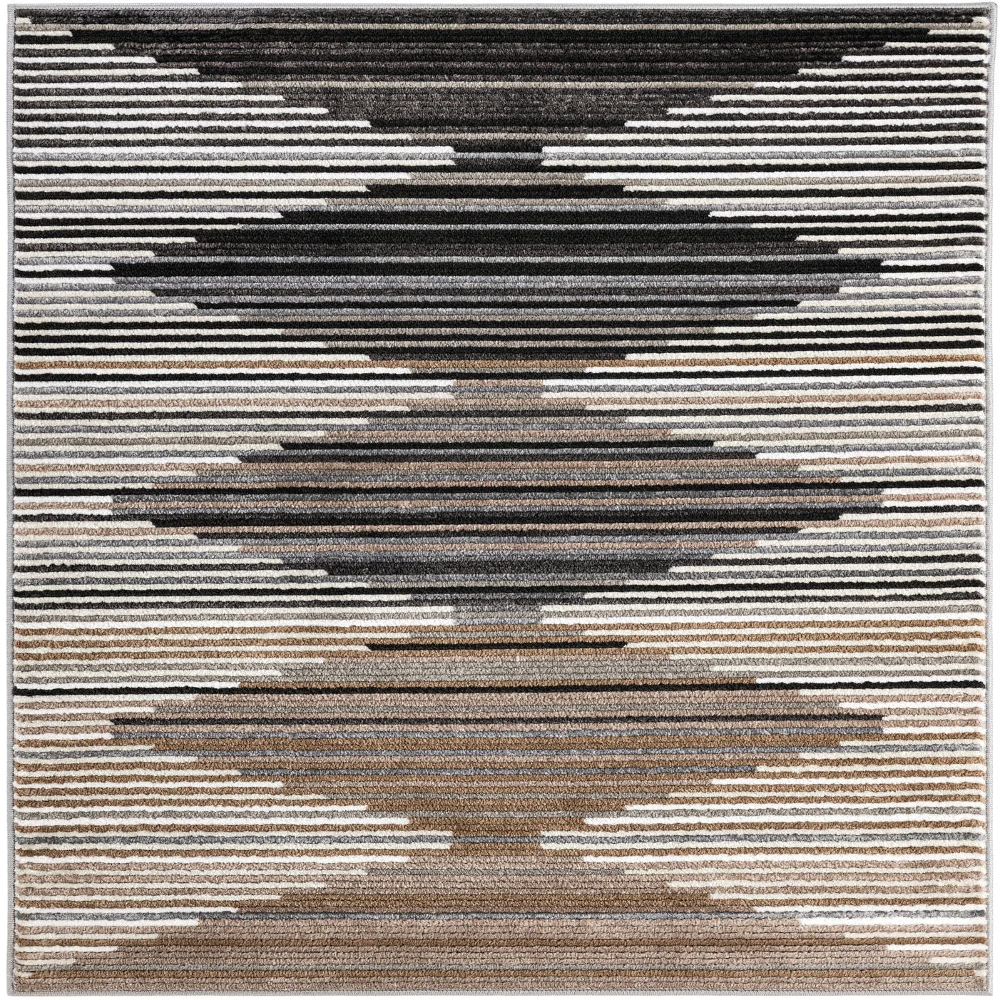 A 4x6 rectangular Odyssey rug with a modern geometric pattern in multi-colored stripes of black, grey, white, and brown.