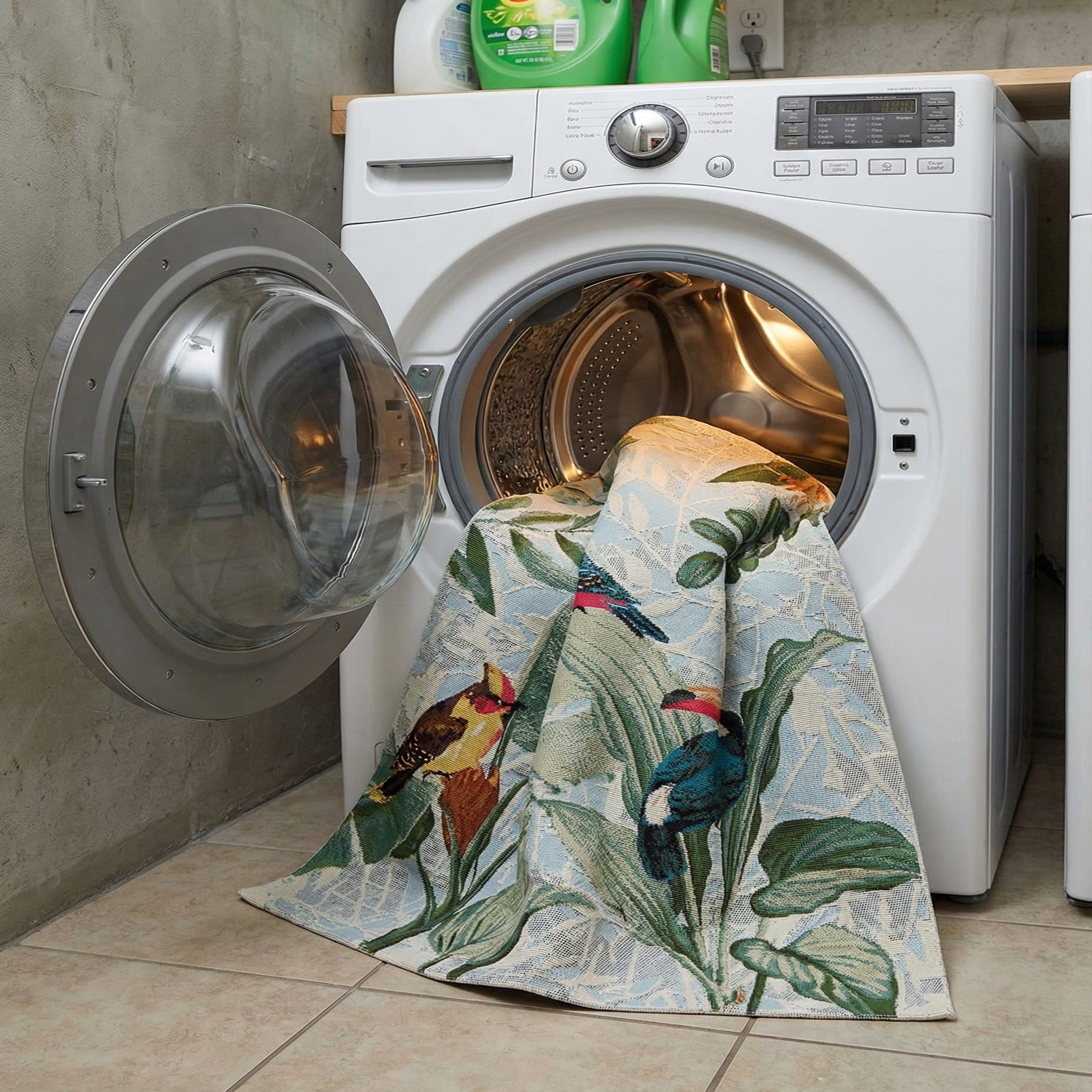 The Outdoor Botanical Collection offers a machine-woven rug crafted from 100% polypropylene, ensuring durability and easier maintenance. This specific piece measures 4x6 feet, providing a versatile size for a variety of layouts. The rug boasts a vibrant botanical pattern, featuring an array of birds perched amongst lush foliage.
