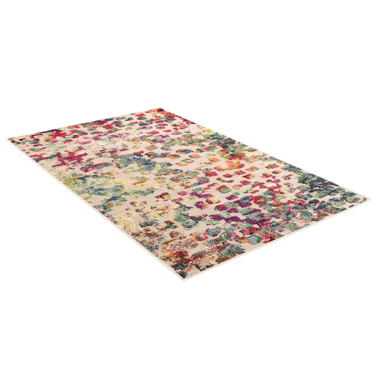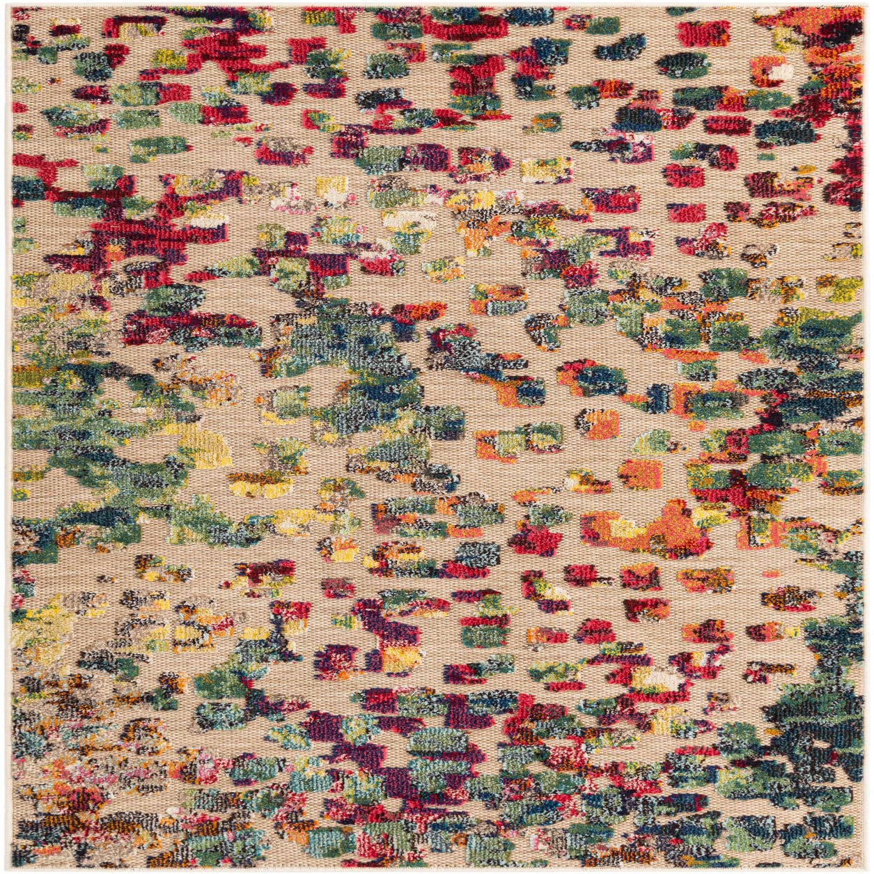 A lively, abstract pattern scatters pixel-like motifs across a multicolored ground woven with warm beige and ivory threads. Blocks of teal, turquoise, hunter green and light blue mingle with richer tones of blue and brown, while bright accents of red, pink, orange and yellow punctuate the field. The overall effect is modern and artful — a contemporary, transitional look that brings energy without a strict geometric repeat.