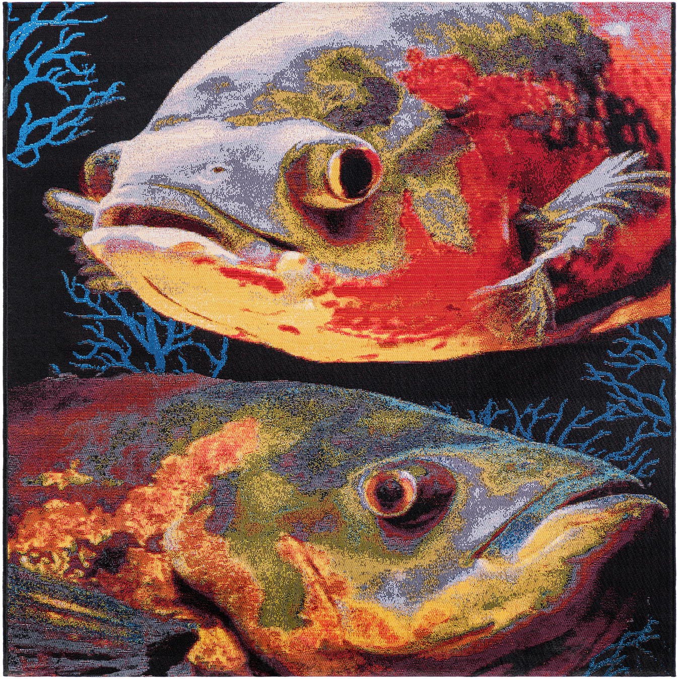 A 4x6 multi-colored rectangular rug featuring two large, vibrant fish with blue coral accents on a black background.