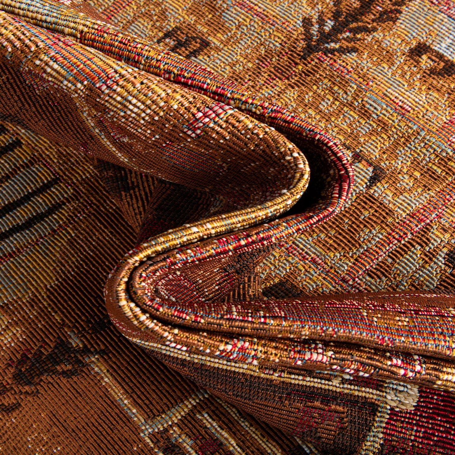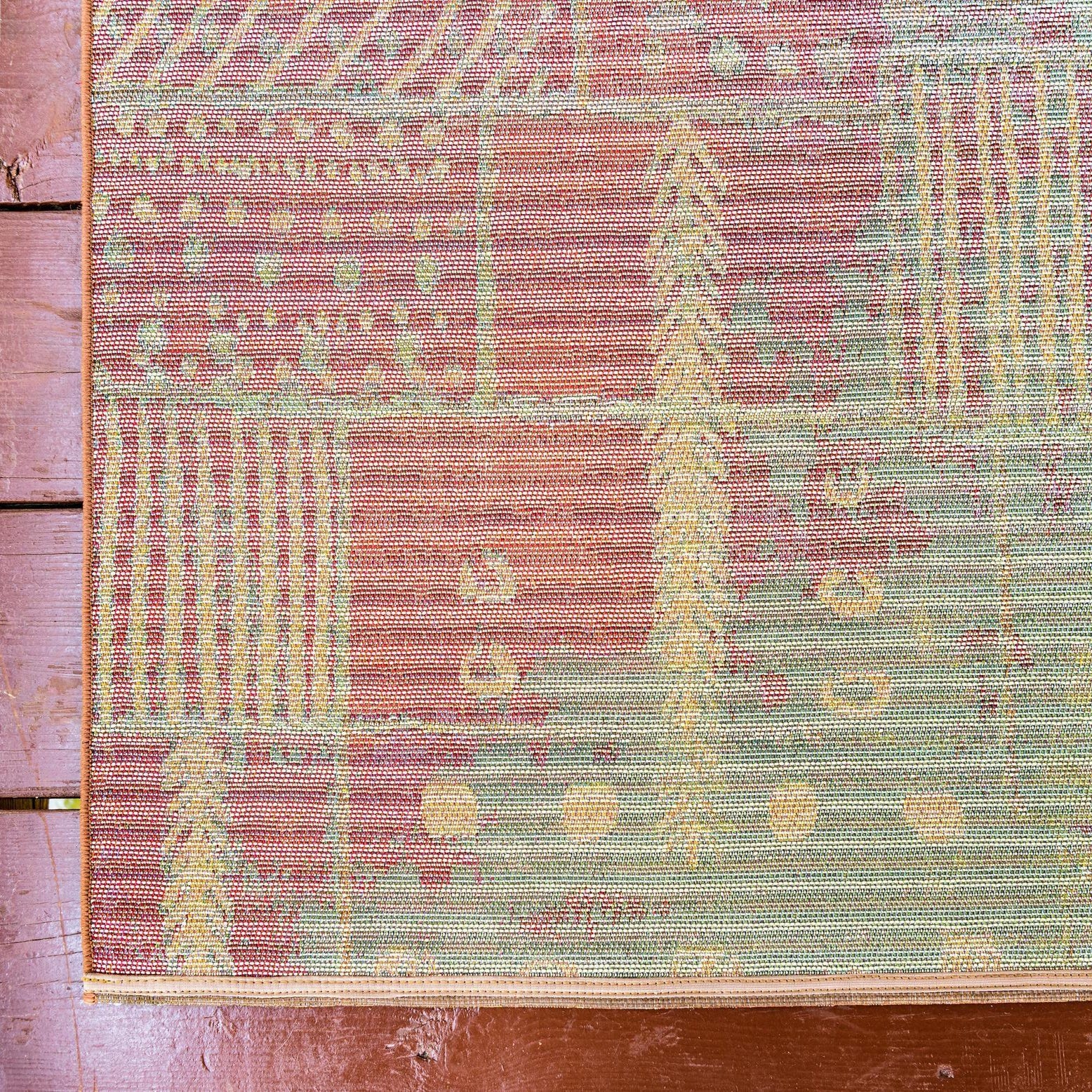 This rug works well on a covered patio or sunroom where you want an indoor look outdoors, and it suits modern or transitional living rooms as a grounding layer under a coffee table. Place it in a cozy reading nook or beneath a small dining set to add color and pattern without overwhelming the space. The mix of earthy tones and subtle color accents pairs nicely with natural wood furniture, metal-framed pieces, or neutral upholstery.
