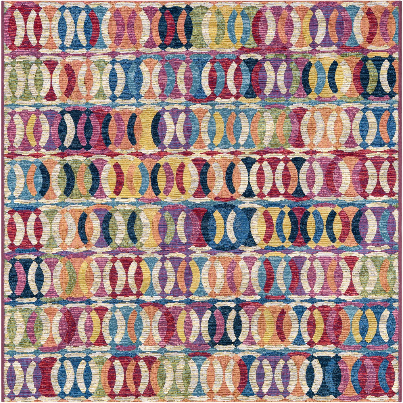 This colorful piece would work particularly well in modern outdoor spaces that celebrate vibrant hues and patterns. It can also serve as a playful contrast in more neutral or monochromatic design schemes, providing a pop of color. Whether integrated into a minimalist aesthetic to add visual interest or paired with similarly bold outdoor furniture, this rug is designed to make a statement while offering practical comfort and wear resistance.