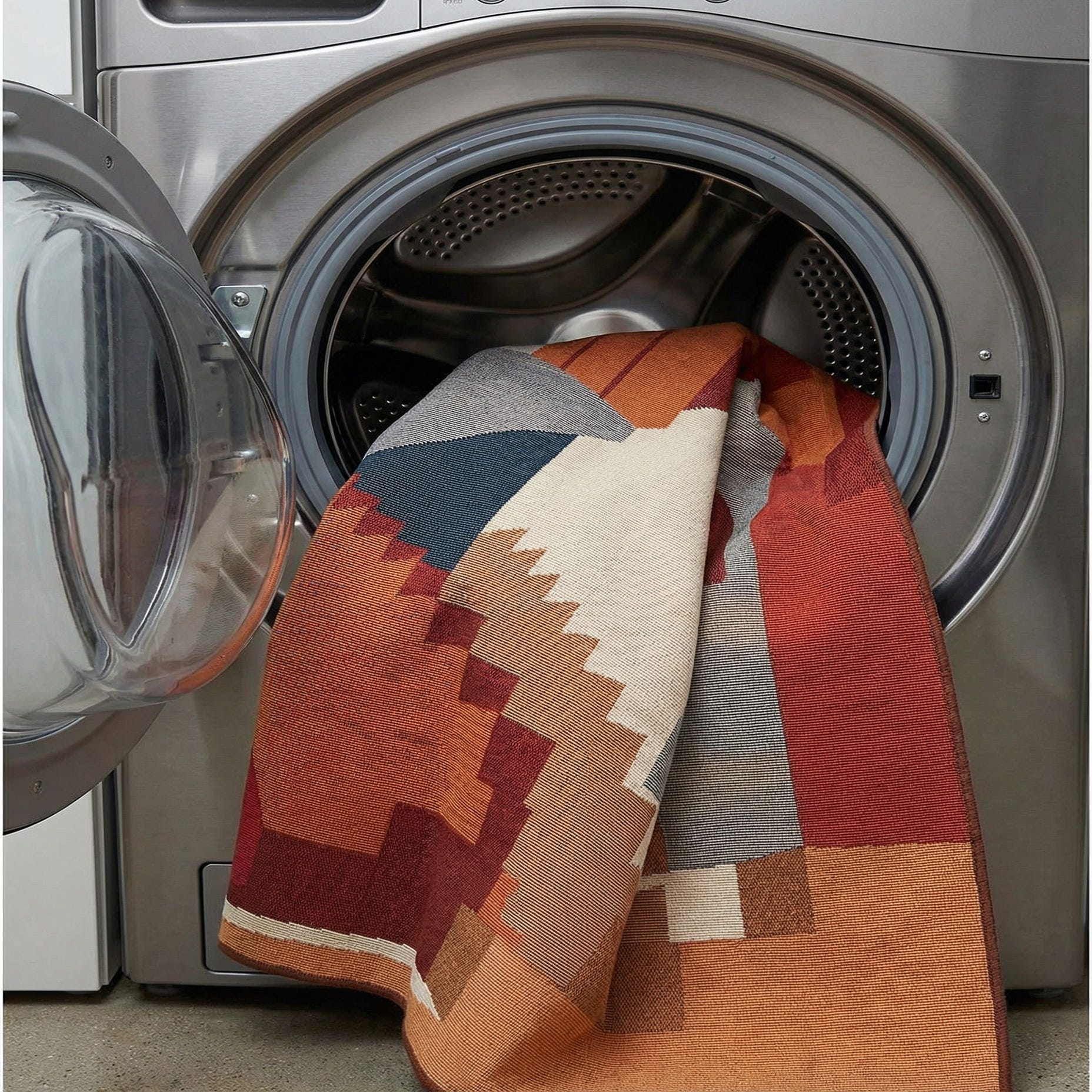 A 4x6 multi-colored rectangular rug with a modern Southwestern architectural pattern featuring shades of orange, red, beige, and blue.