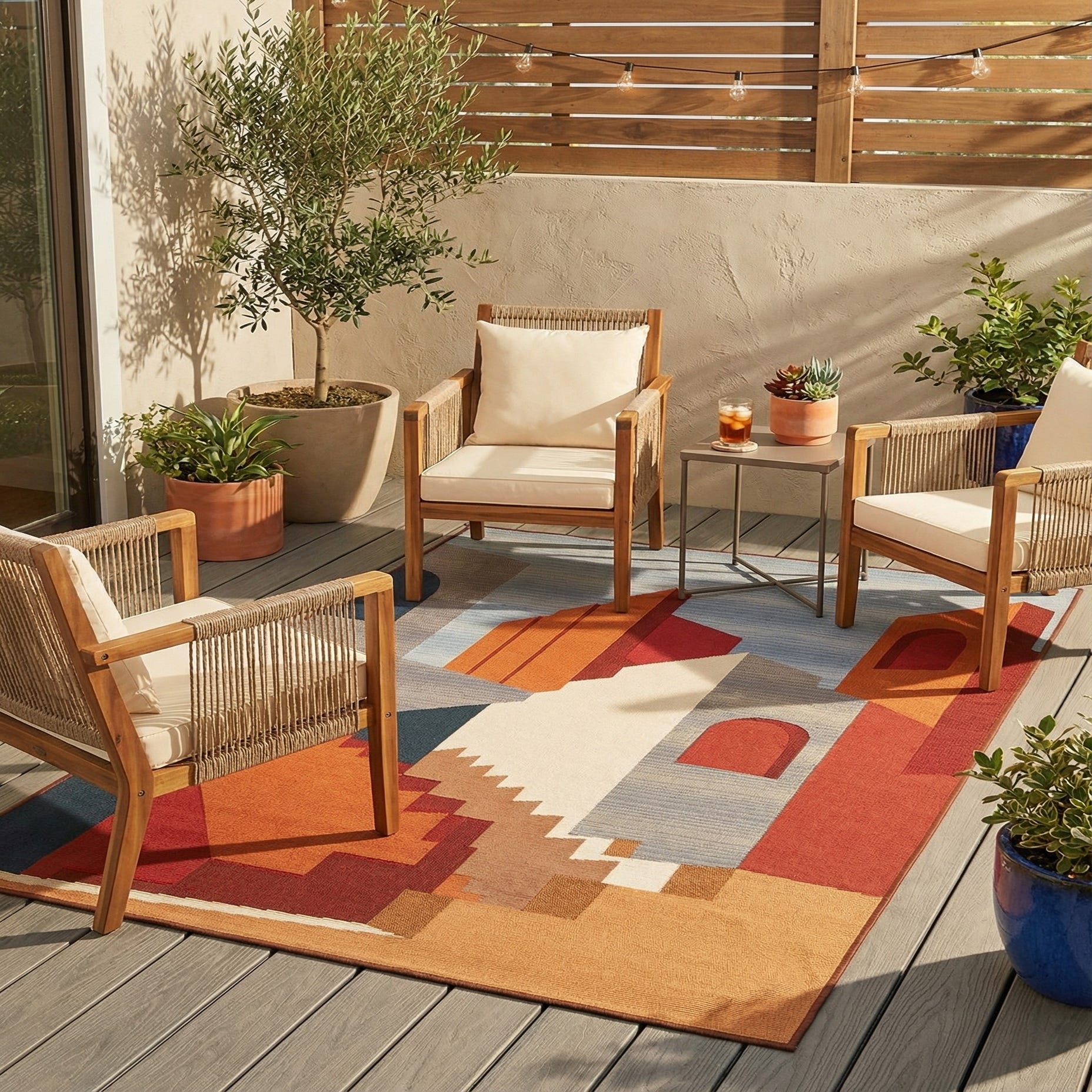 A 4x6 multi-colored rectangular rug with a modern Southwestern architectural pattern featuring shades of orange, red, beige, and blue.